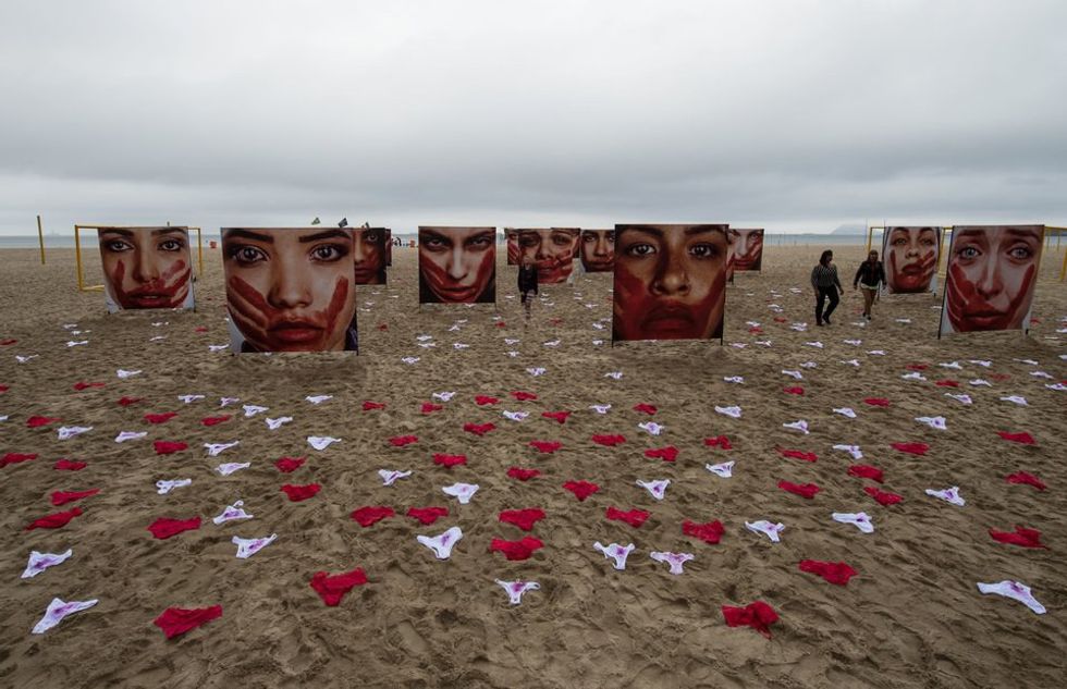 Breaking news: Taking part in a nationwide protest for violence against women, over 400 pairs of underwear were covering Copacabana beach in Rio de Janeiro. There were hundreds of pairs of red and white underwear surfacing the sands of this famous beach, along with pictures of women with bloody hand prints on their faces, symbolic to the situation. These photos of the models were actually part of an art project, by photographer Marcio Freitas, named "I Will Never Be Silent."The 420 pairs of underwear represents the number of women who are raped every 72 hours in Brazil, with a total of 50,000 women each year. However, that crime is severely under reported.