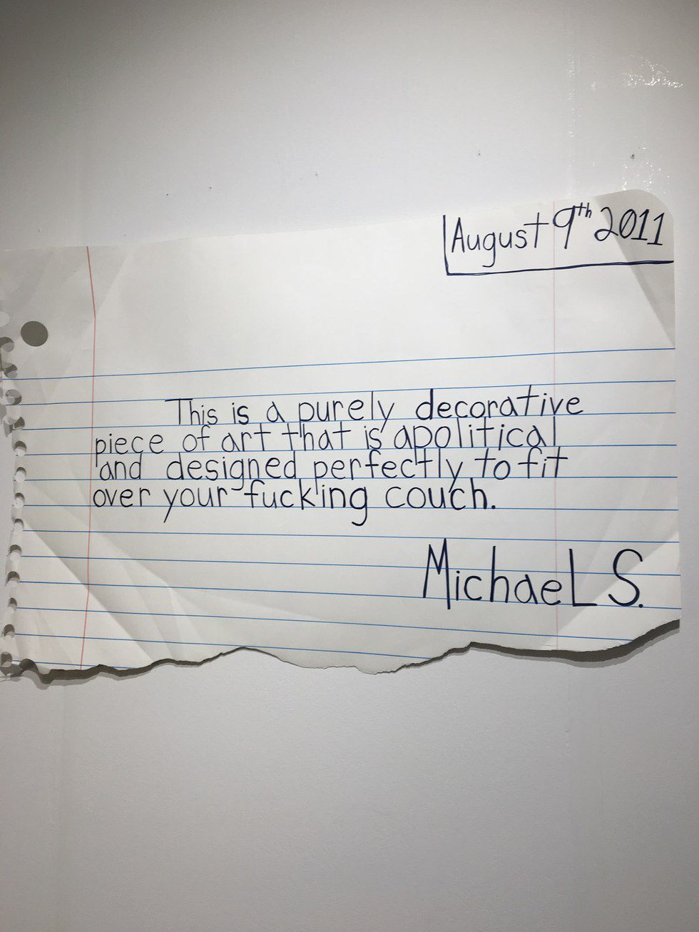 Another interesting piece at Scope Miami was a large scale handwritten note by the artist Michael Scoggins on sale for $8,000 dollars at the show. I felt that the note was basically a stab at what the art world has become. Scoggins was taking a jab at consumers who simply buy art to decorate their homes instead of buying a piece of art for the message it is portraying.