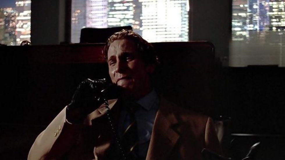 Let's move on to a scene that shows Bateman in probably his truest form. A detective comes in to talk to Patrick about the disappearance of Paul Allen regarding the fact that he was one of the last people to see Allen. The detective says, "One day someone is walking around, going to work..alive and then..," Bateman interrupts and whispers enthusiastically, "Nothing." And the detective just nods after that. That would have definitely been a red flag for me but maybe we are not meant to know what the detective is actually thinking. Although, personally I believe the detective does not think that Patrick is the killer. This slip from Patrick says volumes about him. He is clearly obsessed with death and being the instrument of said death. He takes pride in hurting others almost as if it's a duty of his to inflict pain on others.