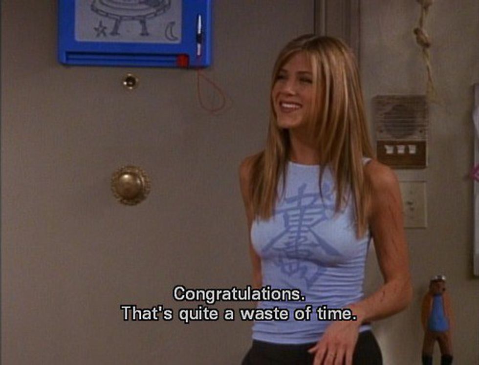 Finals are upon us! The word "sleep" has become obsolete, and all I would like to do is go home and watch "Friends". So, here are the views of college as told by "Friends".