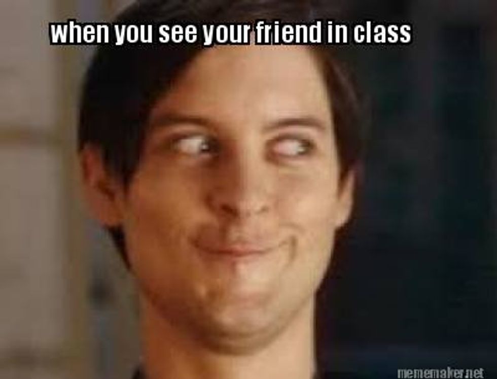 You walk into your class. You hope you are in the right room. You scan the room for any familiar faces that you could maybe suffer through the class with.