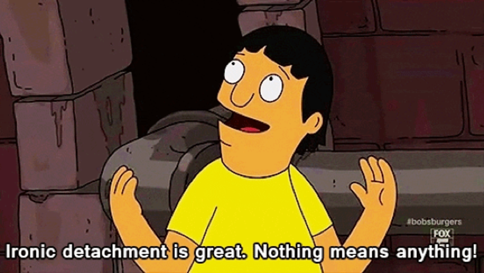 4. “But ironic detachment is great! Nothing means anything!" Because you're “soooo happy" for them…and not jealous at all.