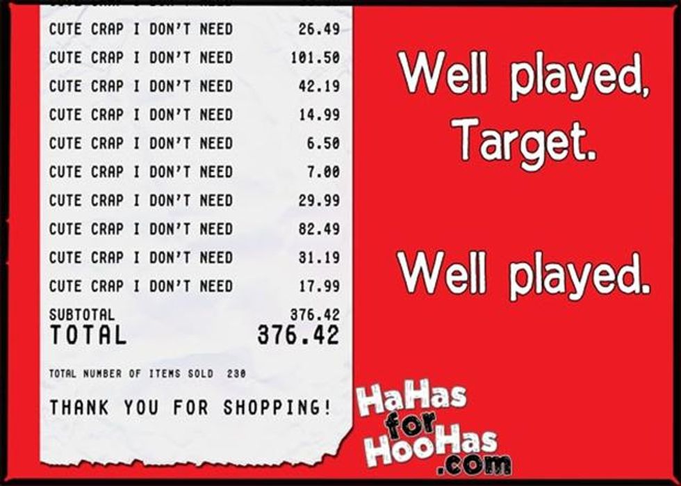 Here’s where it’s all laid out on the line. Hands full, you patiently wait your turn and throw all of your items on the belt. Forgetting you even picked up a candle, and that pair of leggings, or that pack of gum, and the $7.99 v-neck. The cashier, Ingrid, asks you how are you, as your heart begins to race and you suffer from a hot flash. Hoping you have enough money in your checking account for these unexpected purchases, you stand there, helpless and anxious. Each item scanned and placed into a bag. She says your total, and a shiver runs down your spine. You swipe your card while Ingrid swipes your soul, and she knows it too. You pick up your bags, and as Ingrid hands you your receipt she says, “Have a nice day,” as if she is trying to aid the searing pain of the Target regret. You take the walk of shame to your car and place your bags in the back seat. Pulling away, you realize...