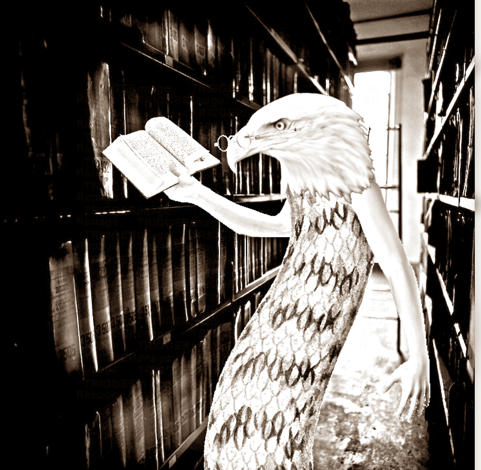 I came upon a bizarre man-creature with the head of an eagle, body of a snake, and the legs and arms of a man. At the tip if it’s beak rested curious spectacles of brass, quite expensive looking. It was lackadaisically thumbing through a sizable book when I came upon it. Slowly I began to walk past it, hand gripped tightly around the handle of Bookslayer. The creature lifted its head from the book it was holding and turned its gaze to me. When its eyes met mine, I was suddenly filled with dread, a dread that ran up and down my spine. The creature looked me up and down, it’s hideous maw bent into a smile and it slowly began to speak to me.