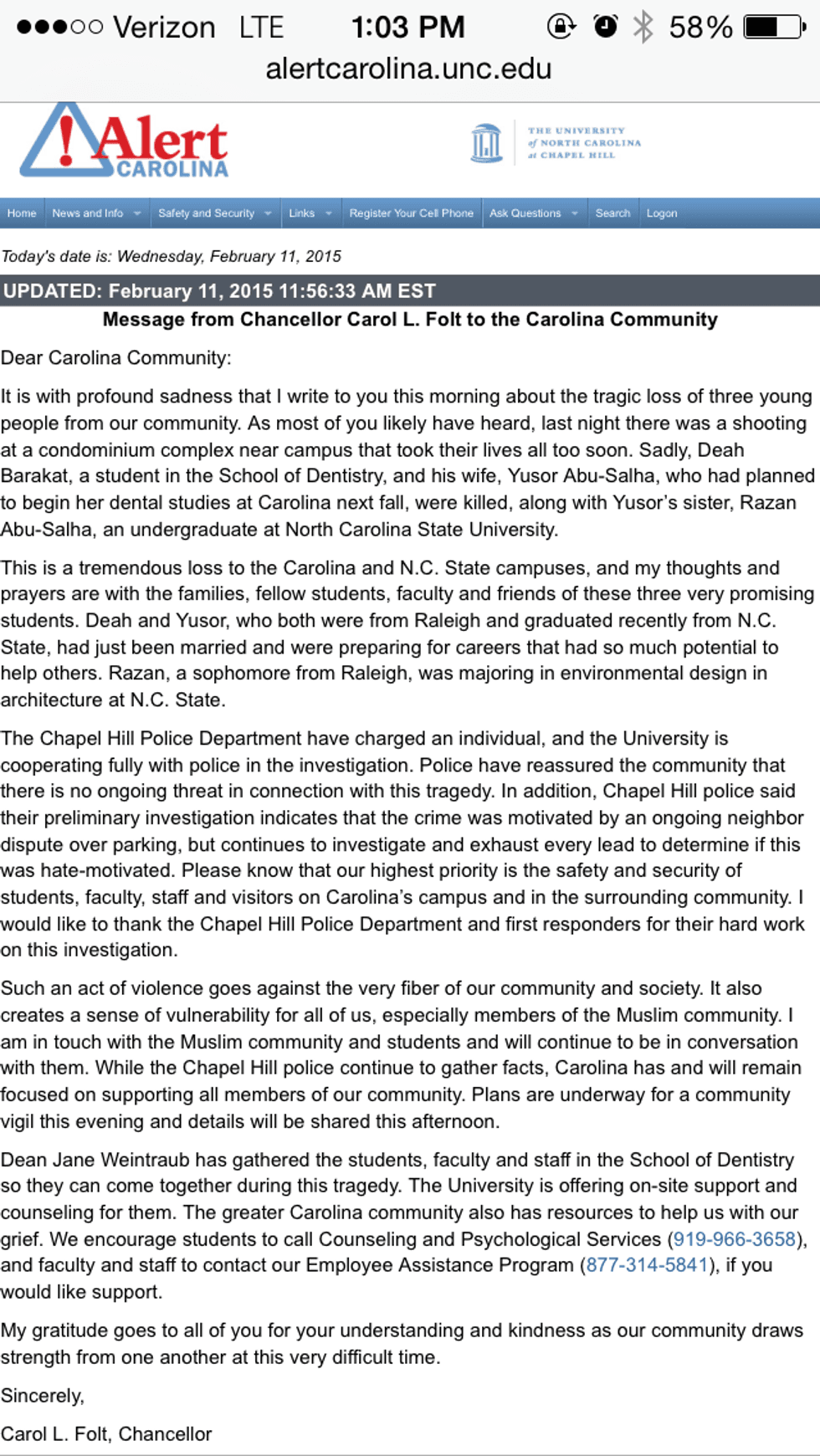 Chancellor Carol L. Folt of UNC-CH has reached out to the Carolina Community through Alert Carolina messages: