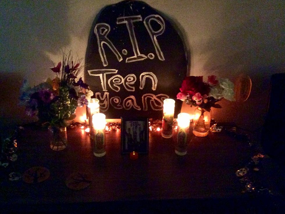 Aside from lights and paper decorations, we also set up a vigil for my teen years that featured a giant tombstone poster that said “RIP teen years,” various candles and lights, and of course, fake flowers as a sign of respect for the loss of my teen years surrounding a framed picture of a cheesy “cool teens” stock photo that I found on google images. Yes, it was over the top, but it also felt so right.