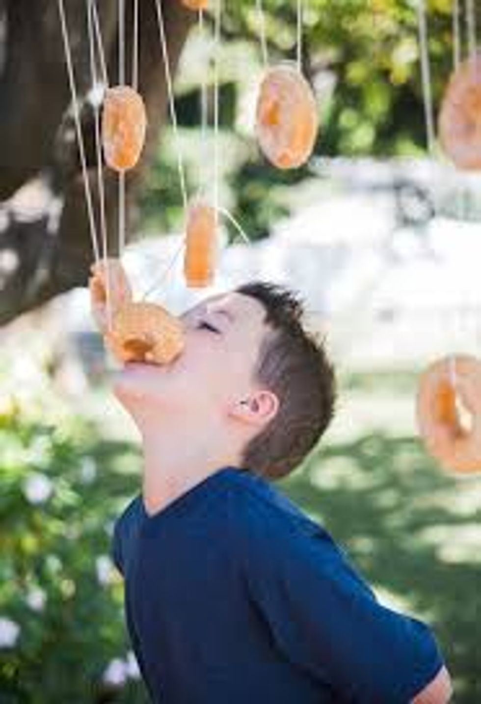 With your hands behind your back, reach to the donut above you and try to be the first to finish it without touching it.