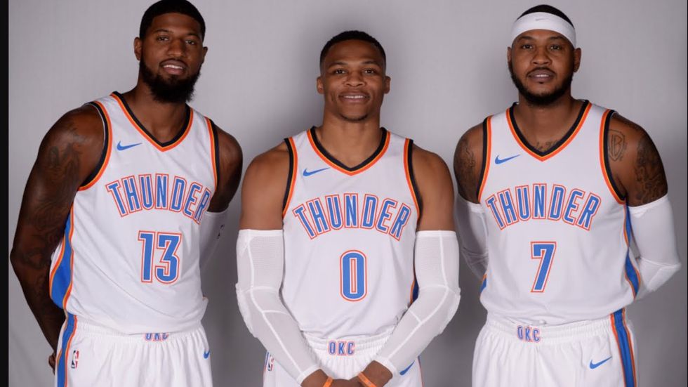 The Oklahoma City Thunder, despite having the 2016-2017 MVP Russell Westbrook were eliminated in the first round of the 2016-2017 playoffs by the Houston Rockets. To make the team better the General Manger Sam Presti gave Thunder fans hope with the arrival of four time NBA-All Star Paul George and 10 time All-Star Carmelo Anthony. These two players were brought to the team not only for supporting Westbrook but also to help bring a championship to Oklahoma, but after 15 games into the season the Thunder are so far in the ninth seed out of 15 in the Western Conference. While to some it seems good, most seem to see it as a horrible start, three All-Stars in one team, yet they can't seem to be in the top five in the NBA.