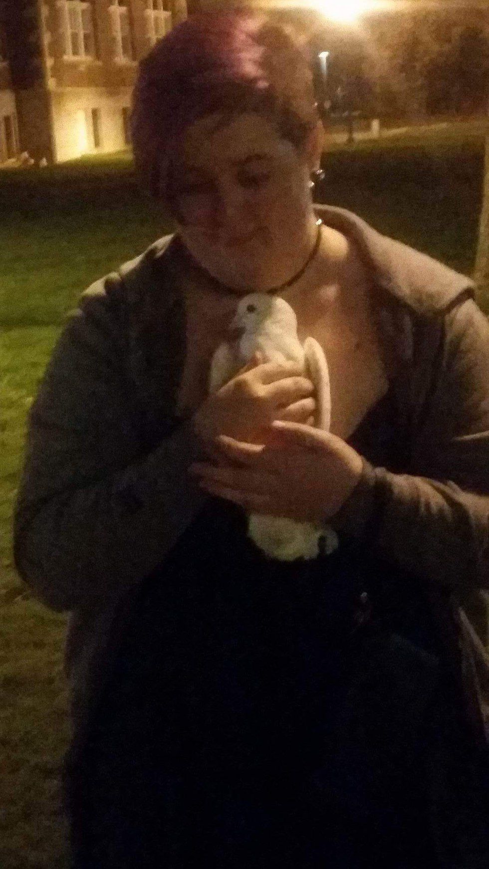 I slowly descended the steps with my friend right behind me and began to head towards where my friends had gone to get help. I held the pigeon close to my chest and whispered gently to her while stroking her chest with my thumb. I wanted to calm her down as quickly as I could and make sure that she was safe. Before we got too far my one friend that had gone for help appeared and started heading towards us. He hadn’t been looking at us initially but immediately reacted when he saw me holding the pigeon (his reaction was a mix between confusion and astonishment).