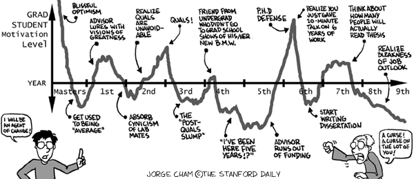 Grad school is a huge undertaking. Just think about committing several years, the better part of a decade, to concentrating on a specific field and delving deeper and deeper into it. People say that you will learn whether or not you like research, whether or not you are willing to commit your career to it. People say that you will learn about yourself, how you handle pressure and deadlines and failure and the constant grind of working in a lab. Depending on who you talk to, you may get a positive or negative view of graduate school. There are popular comics about the trials of grad school life: