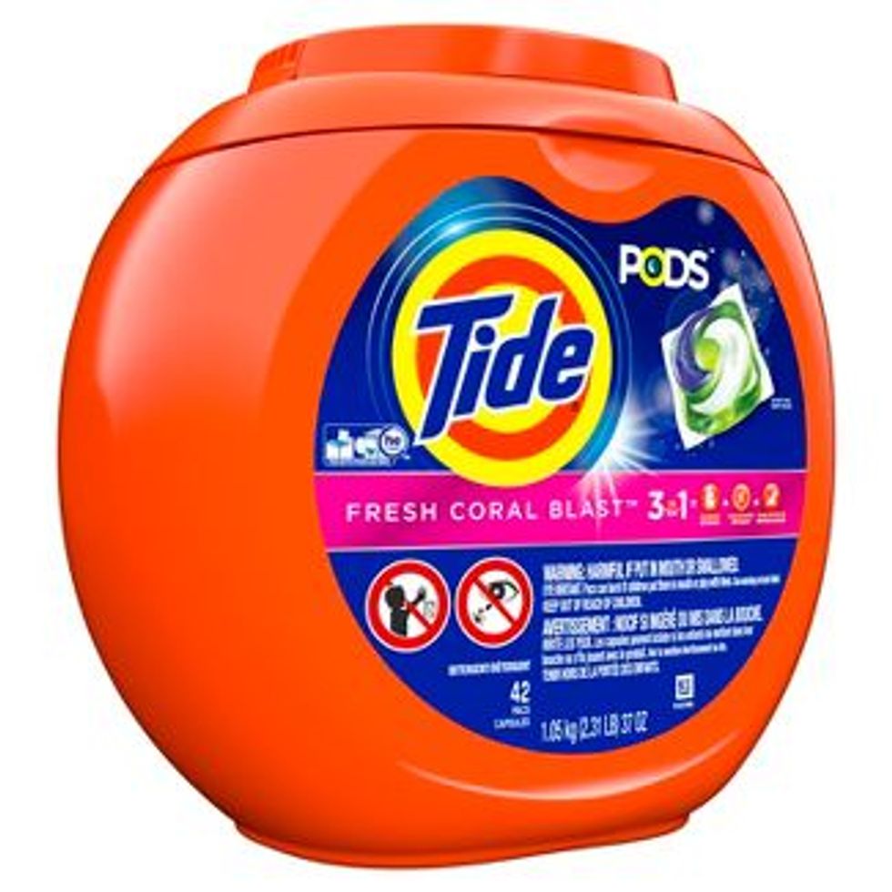(Also, I didn't get a picture of my own bag of "Fresh Coral Blast" Tide Pods because my ring finger is the only one that can actually move still, so I couldn't operate a camera. Here's a picture of its packaging from Target!)