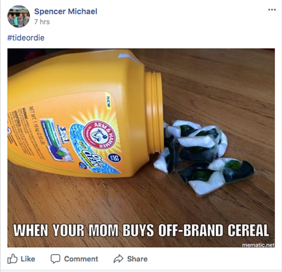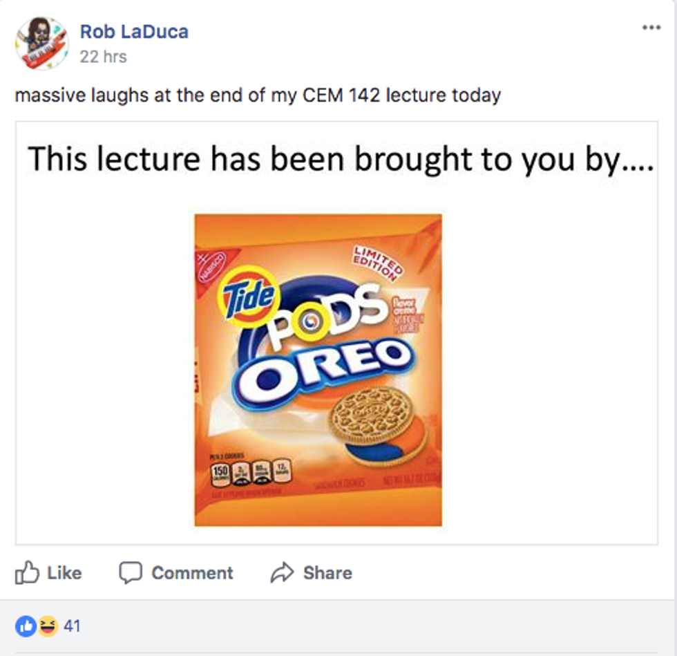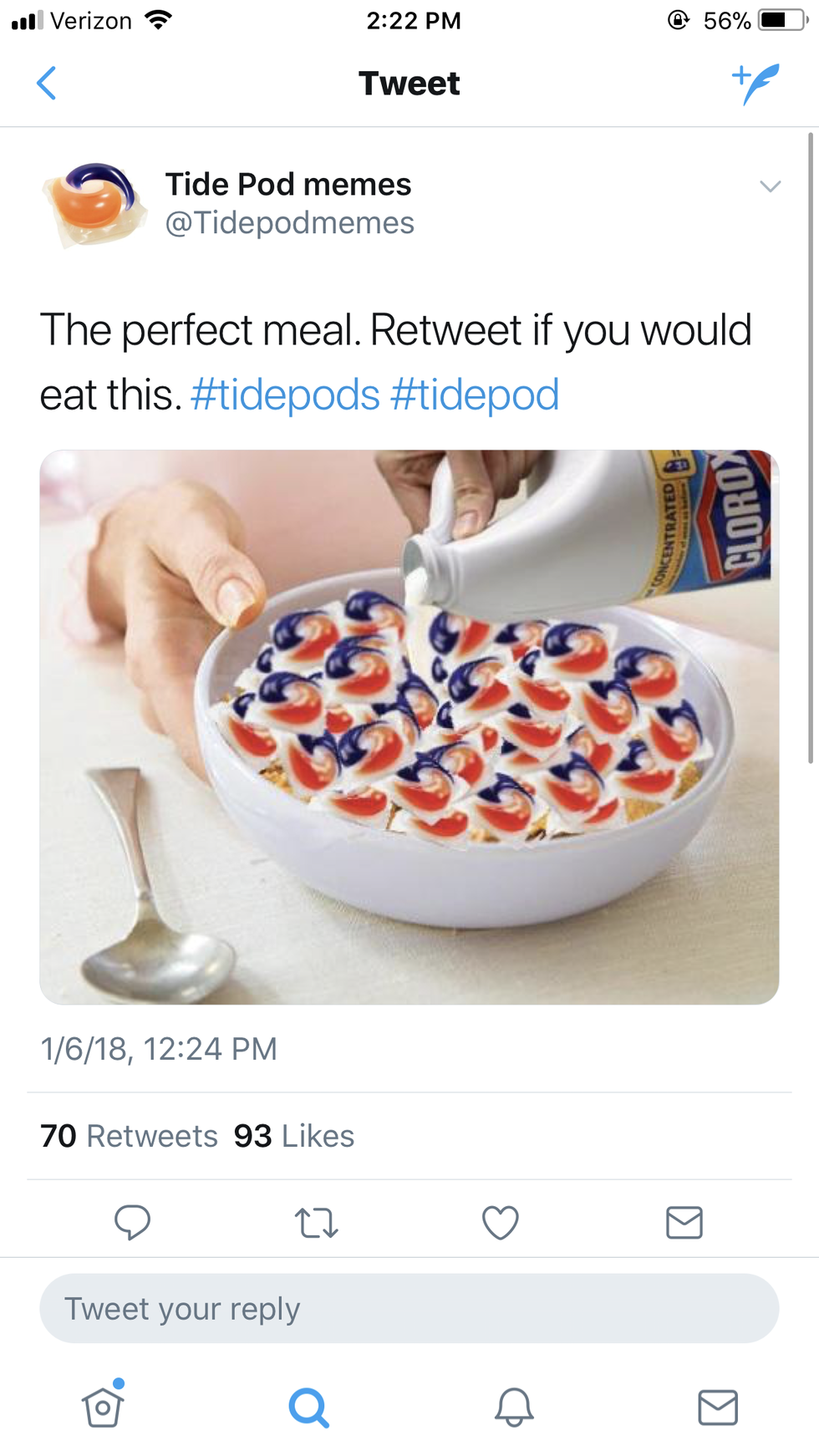 What's crazy to me is how fast this spread. I went to bed last night not realizing what was happening, and woke up this morning with Tide Pods all over my feed. Even one of my old professors got into it...