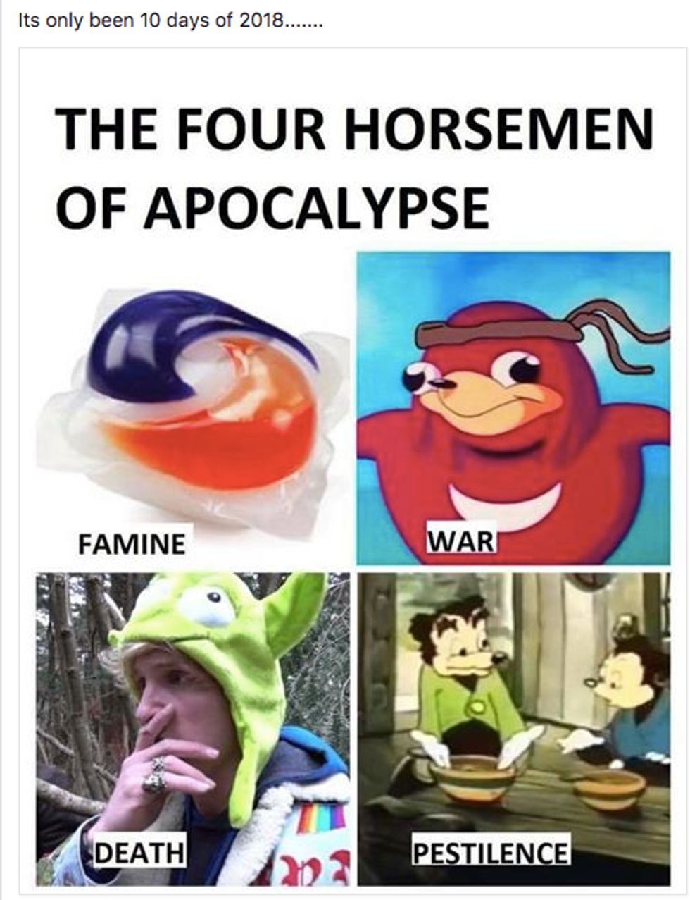 It doesn't stop there, the memes are endless. 2018 is off to a great start; 2 weeks in and Logan Paul is banned from YouTube for his disgusting video, people are eating Tide Pods, and MSU's activity board has hosted a dildo making night. What is this year? Morale is low for 20-something's apparently. Seriously, don't eat these things. It's poison. Don't be an idiot.