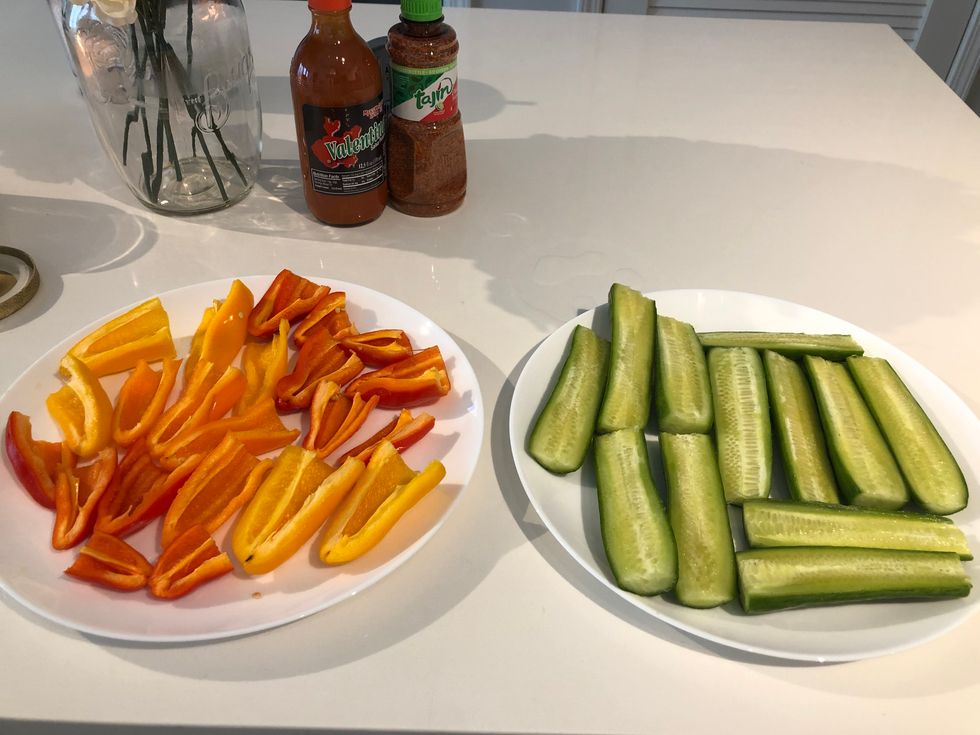 I blotted some hot sauce on each pepper and cucumber, ensuring that each bite would be flavorful and spicy.