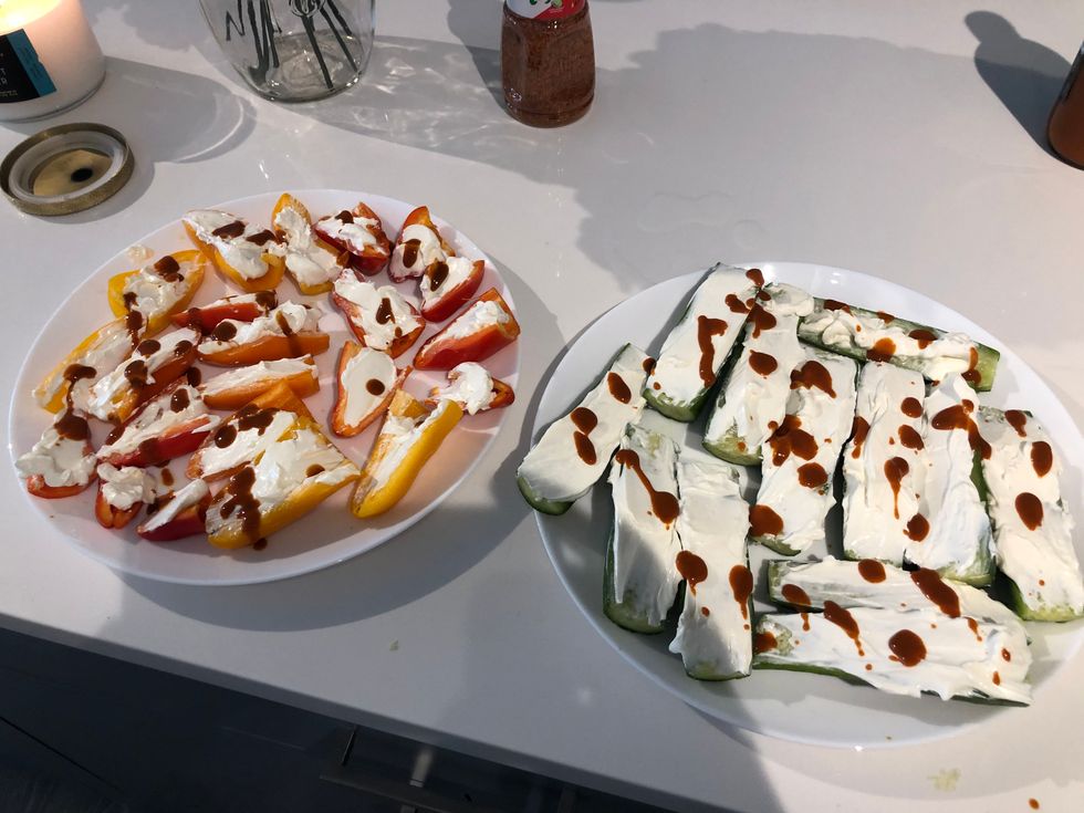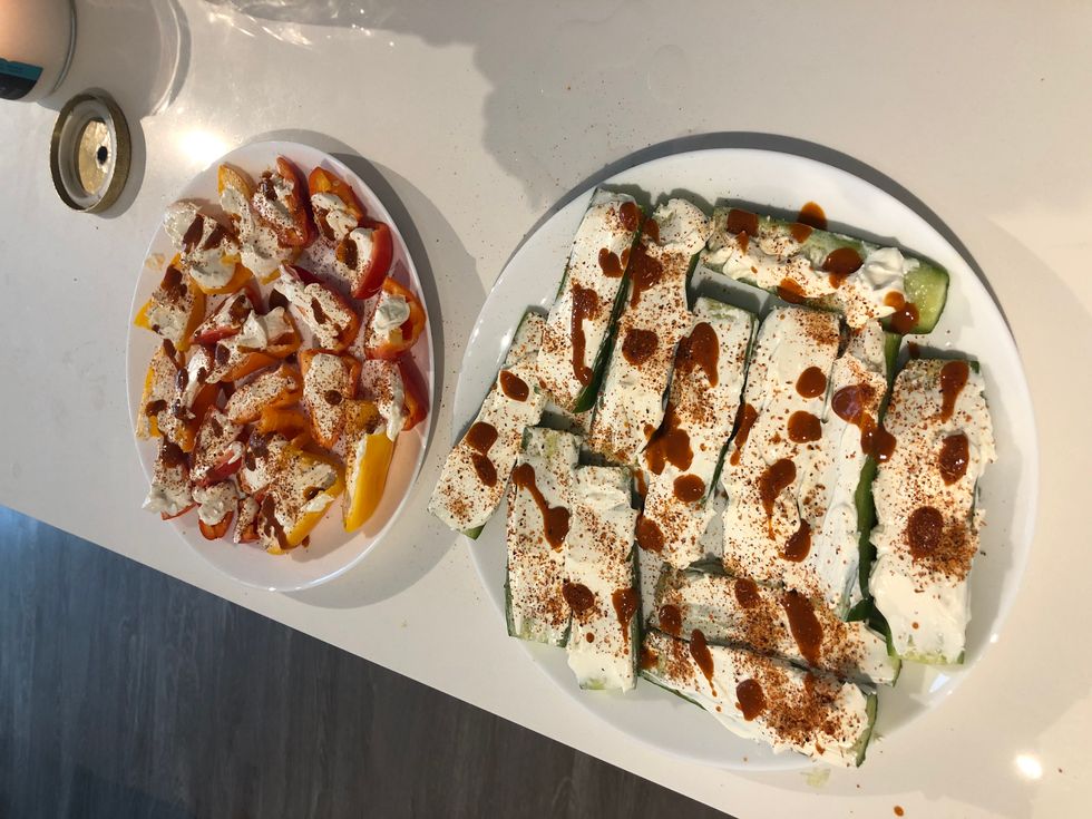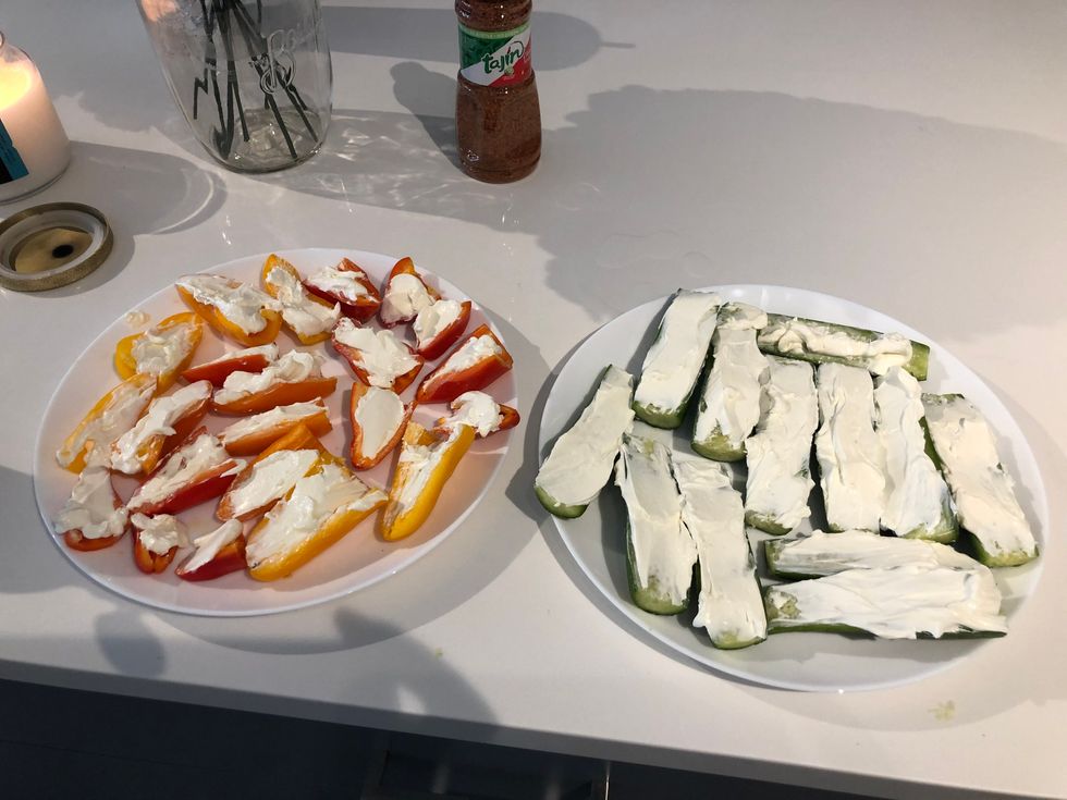 I took a spoon and scooped a generous amount of Philadelphia cream cheese into the bell peppers and on top of the cucumbers.