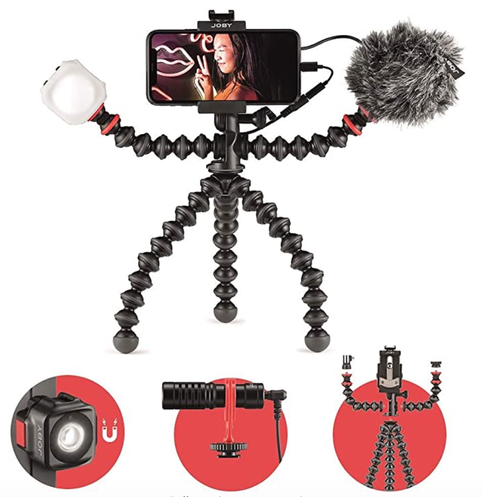 6. This vlogging kit with a smartphone tripod, mobile mic, and LED light