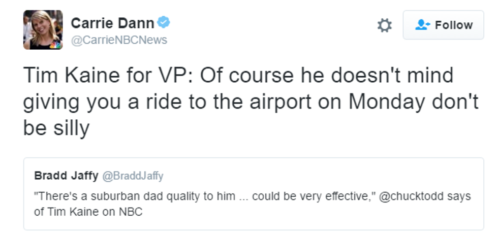 On July 22 at 7:12 p.m. I tweeted, “If @timkaine is Clinton’s VP pick that makes me feel better about begrudgingly voting for her." An hour later at 8:13 I got my wish. A notification from CNN saying Kaine was indeed tabbed by Hillary Clinton to be her running mate popped up on my phone. I was ecstatic. As a Virginian, I was very familiar with our two moderate democratic Senators and former Governors in Tim Kaine and Mark Warner. They are both esteemed politicians, and in a state where political controversy has been aplenty lately, most notability former Governor Bob McDonald's corruption case (which is currently making its way through the Supreme Court) Kaine and Warner are the shining examples of the best of Virginia politics; beloved democrats in a conservative-leaning state. I also see their face on national TV quite often, confirming to me their strong presence at the national level.