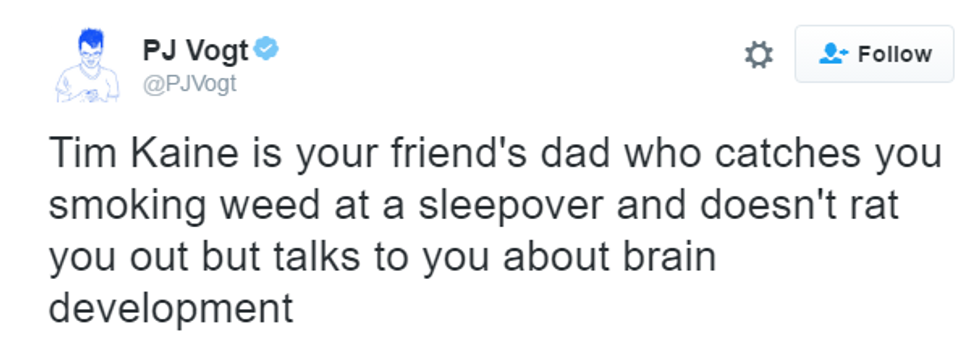 All jokes aside. Tim Kaine is who you want in a politician even if he has the mannerisms of a really white suburban dad. Trevor Noah on the Daily Show described him as "a real life version of black people's impersonation of white people. He makes Mike Pence (Trump's VP) look like DMX." I'll admit, I heard that live and laughed for a minute straight. Okay, actually all jokes aside. I have never been a big fan of Hillary Clinton, but I will give her the benefit of the doubt, she hit the nail on the head with Tim Kaine. I am certainly with him, and that is enough for me to be with her. And by the way, Tim Kaine has never lost an election.