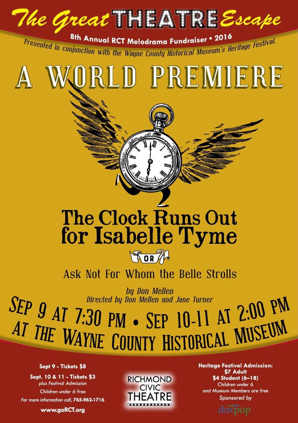 It's that time of year again — time to present the 2016 Richmond Civic Theatre Melodrama! This year's world-premier melodrama, written by local playwright, Donald Mellen, is entitled, "The Clock Runs Out for Isabelle Tyme, or Ask Not for Whom the Belle Strolls."