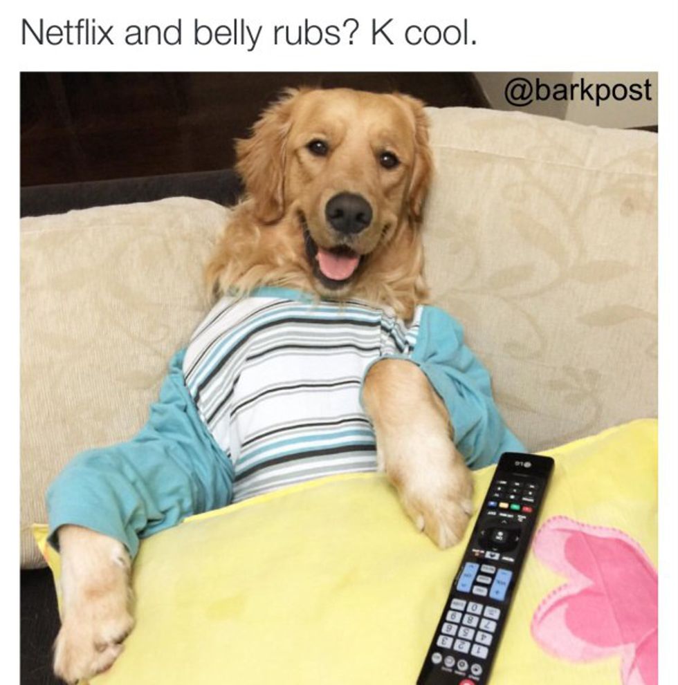 Nope, not today. Netflix and belly rubs all day to make this tail-wagger happy. Sure, sitting down to watch an episode or five on Netflix is relaxing, but this dog also requires a belly rub to make him happy.