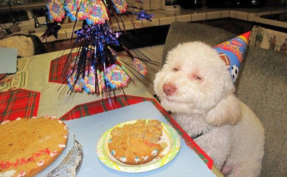 Greedy? Sad? Unappreciative? Nope, all smiles and appreciation for this birthday dog. Mmm, maybe cake tastes better than food off the floor after all...