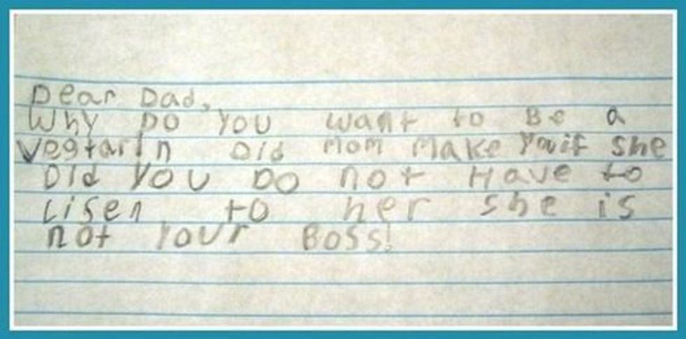7. "Dear dad, Why do you want to be a vegetarian? Did mom make you? If she did you do not have to listen to her, she is not your boss!
