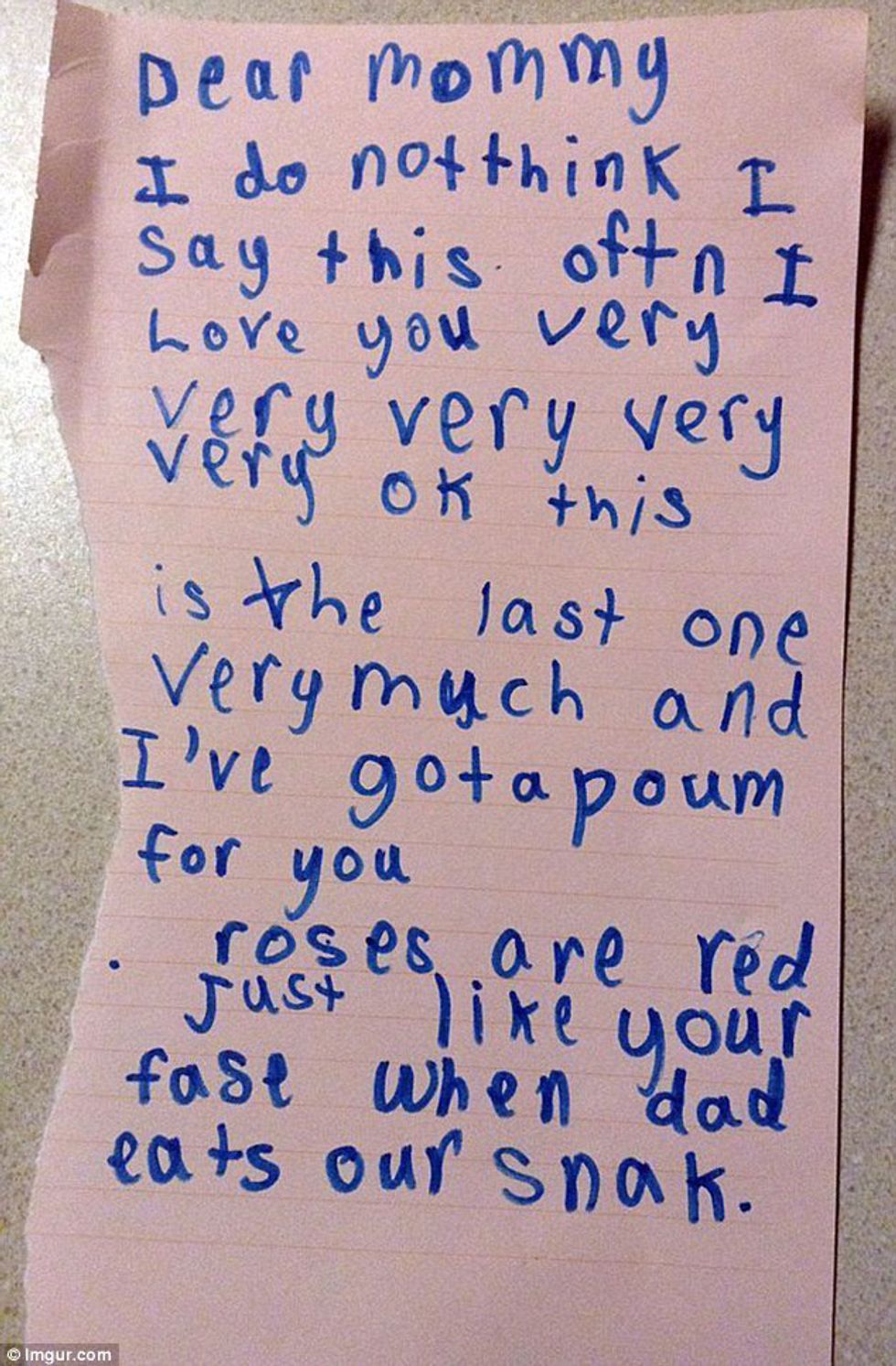 8. "Dear mommy, I do not think I say this often. I love you very very very very very, ok this is the last one, very much, and I've got a poem for you. Roses are red just like your face when dad eats our snack."
