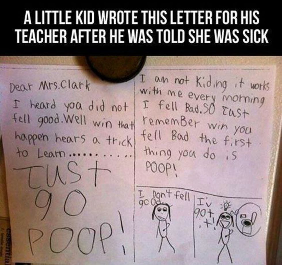 9. "Dear Mrs.Clark, I heard you did not feel good. Well when that happens, here's a trick to learn... Just go poop!"
