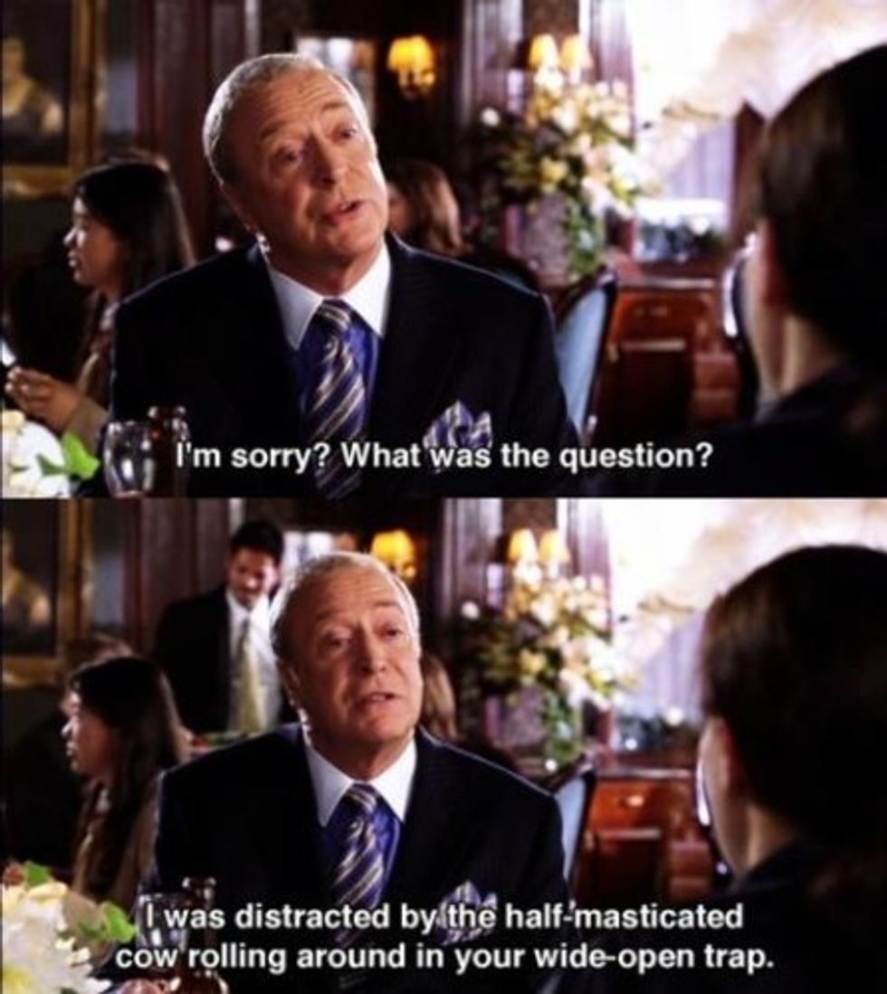 She demonstrates here that no woman should have to take any crap from a man, and especially not to let anyone, male or female, point out your shortcomings in a cruel manner, though this scene was portrayed in good fun with a bit of that charming Michael Caine flair.