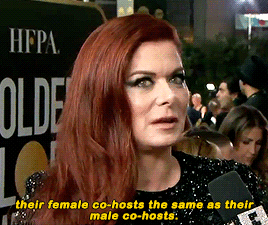 She didn't wait for the show to start to throw shade. While being pre-show interviewed by the E! network with Giuliana Rancic, Debra Messing said (on LIVE television TO Rancic), "I was so shocked to hear E! doesn’t believe in paying their female co-hosts the same as their male co-hosts. I miss Catt Sadler. We stand with her.” Spill that tea, girl.