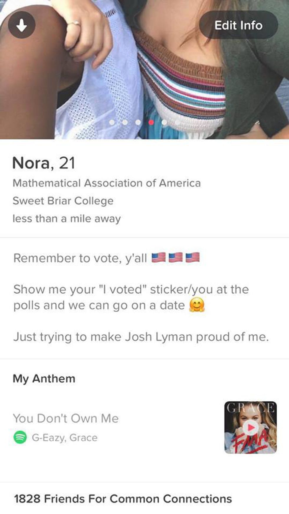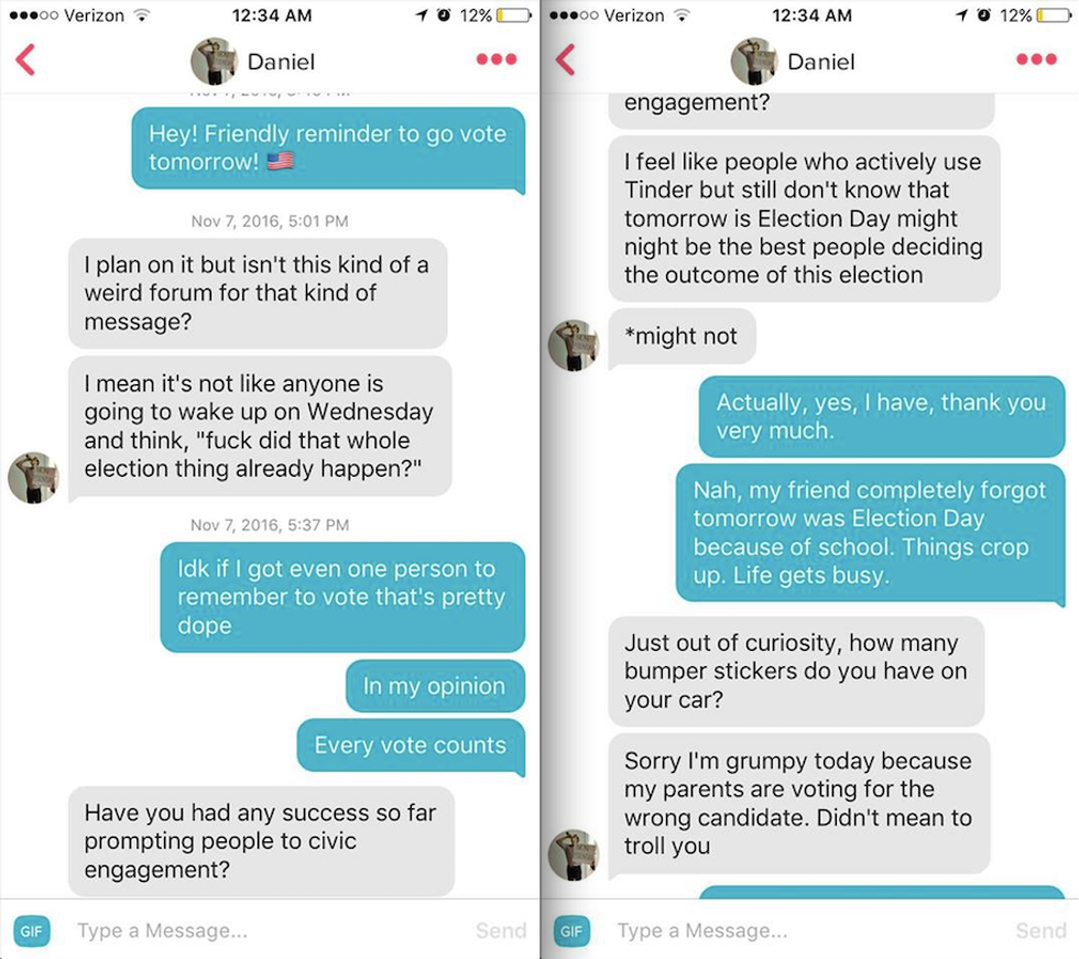 Among these people was Nora Baron, who, while she wasn't volunteering directly with a campaign or a party, worked hard to turn people out to the polls to vote on election day. She didn't do this by making phone calls or block walking. Instead, she did this in probably the most unique way possible — by using her Tinder profile.