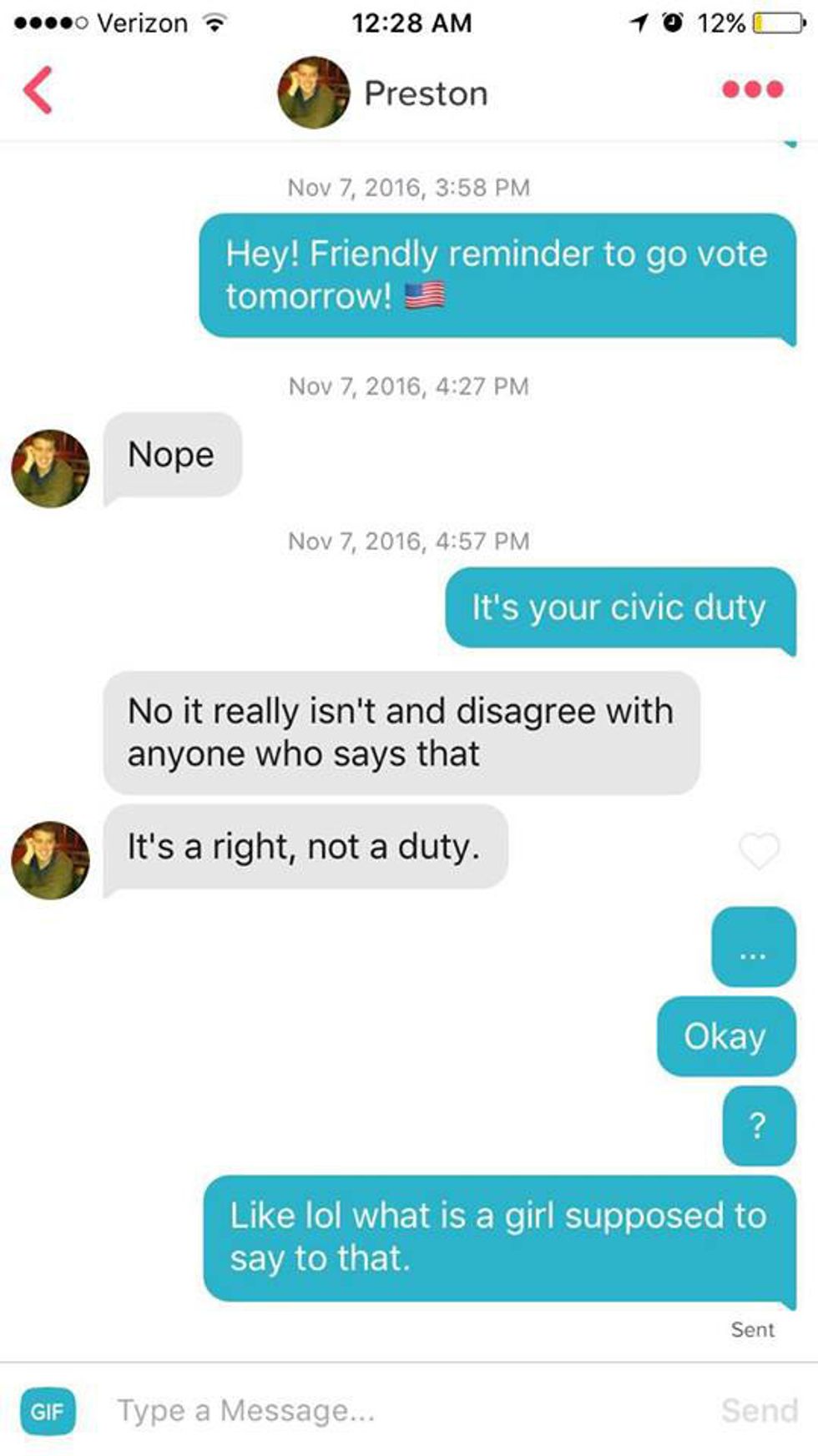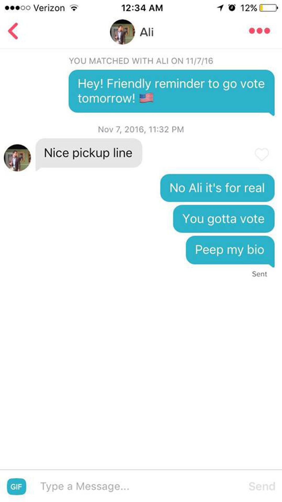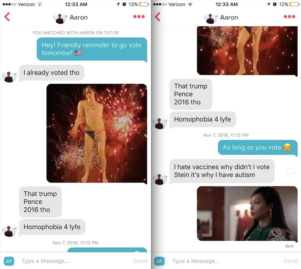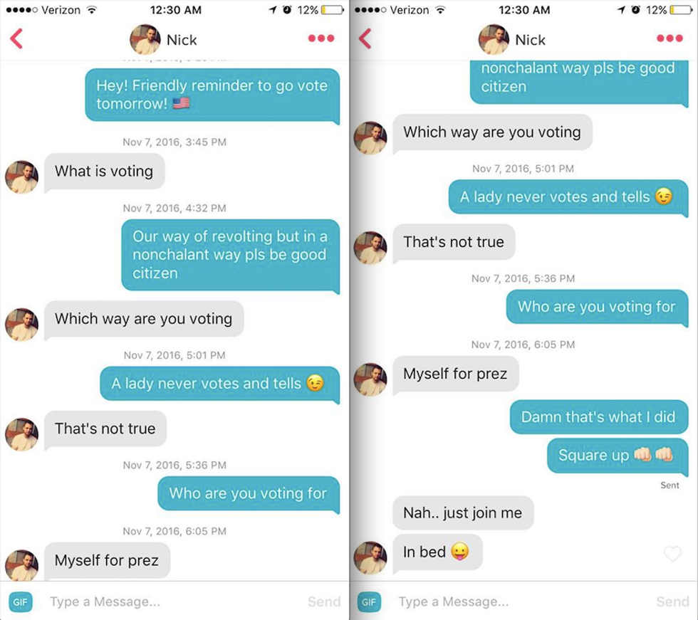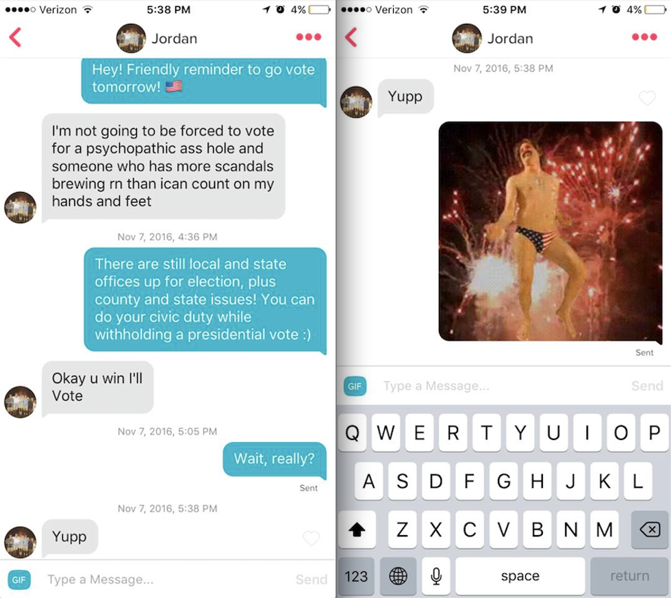 Then, she began messaging every single guy she had ever matched with — all 247 of them — with a reminder to go vote in the presidential election. The reactions varied.