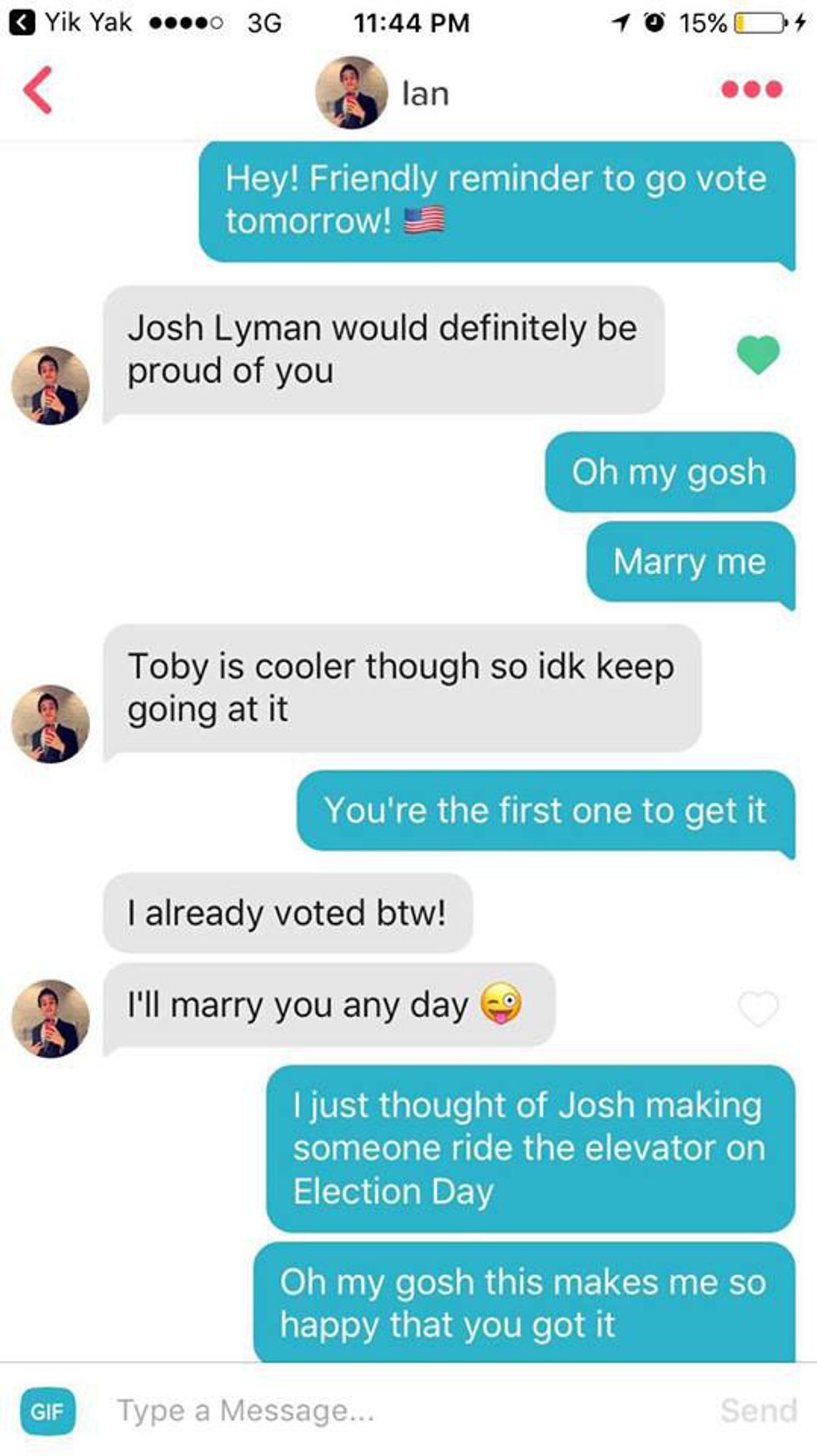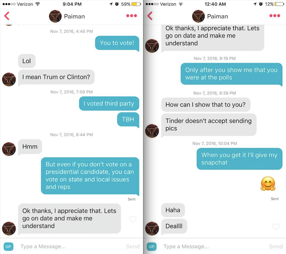 And yes, she did actually give them her snapchat, got multiple pictures of the "I voted" stickers, and got a few dates out of all of this — even though her only intention was to get people to the polls!