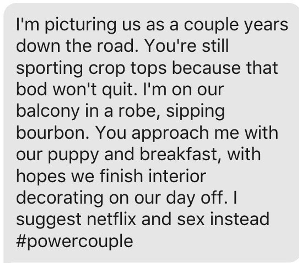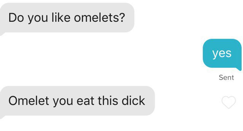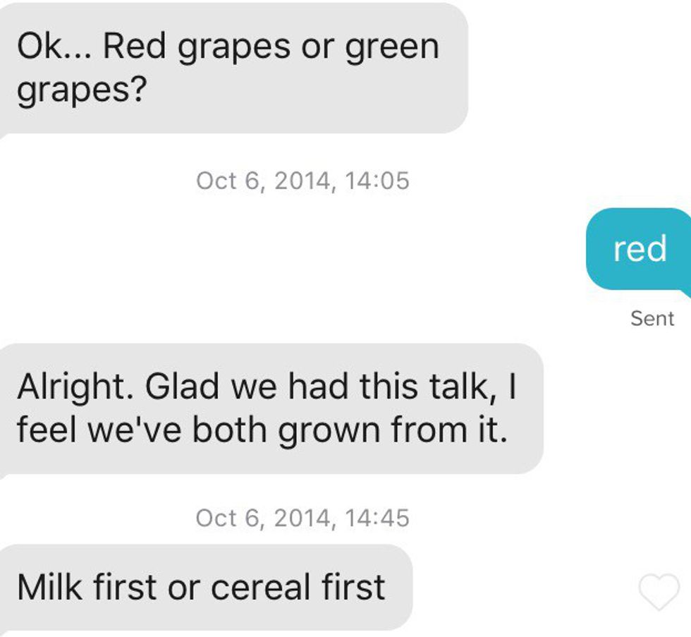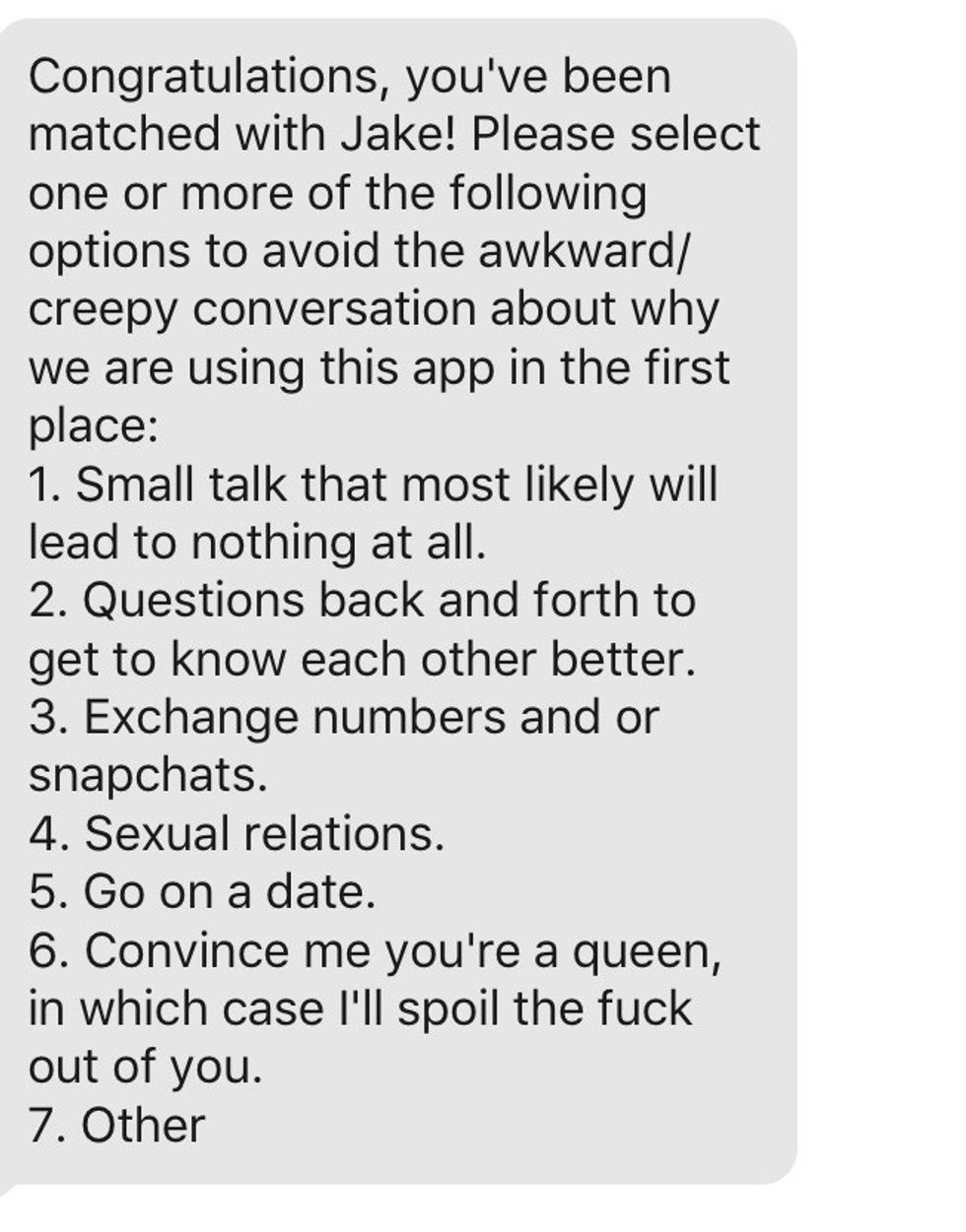 Tinder. I don't remember my first interaction with Tinder, but I imagine it was 2013 -- or the summer of 2014 -- when I was in a long distance relationship and bored. I've never taken Tinder seriously; my friends and I use it like a video game. Some describe it as window shopping for people. As we become more technologically savvy and socially awkward, Tinder becomes the prime mating spot for the shy and uncomfortable. My friend's aunt is engaged to someone she met on Tinder. I lost a seven year best friend because of her dedicated relationship to a boy she met on Tinder. So, do dating apps bring us together or apart? Who cares. They're full of innuendos and wordplay, which for 3 a.m. on a Monday night isn't so bad.
