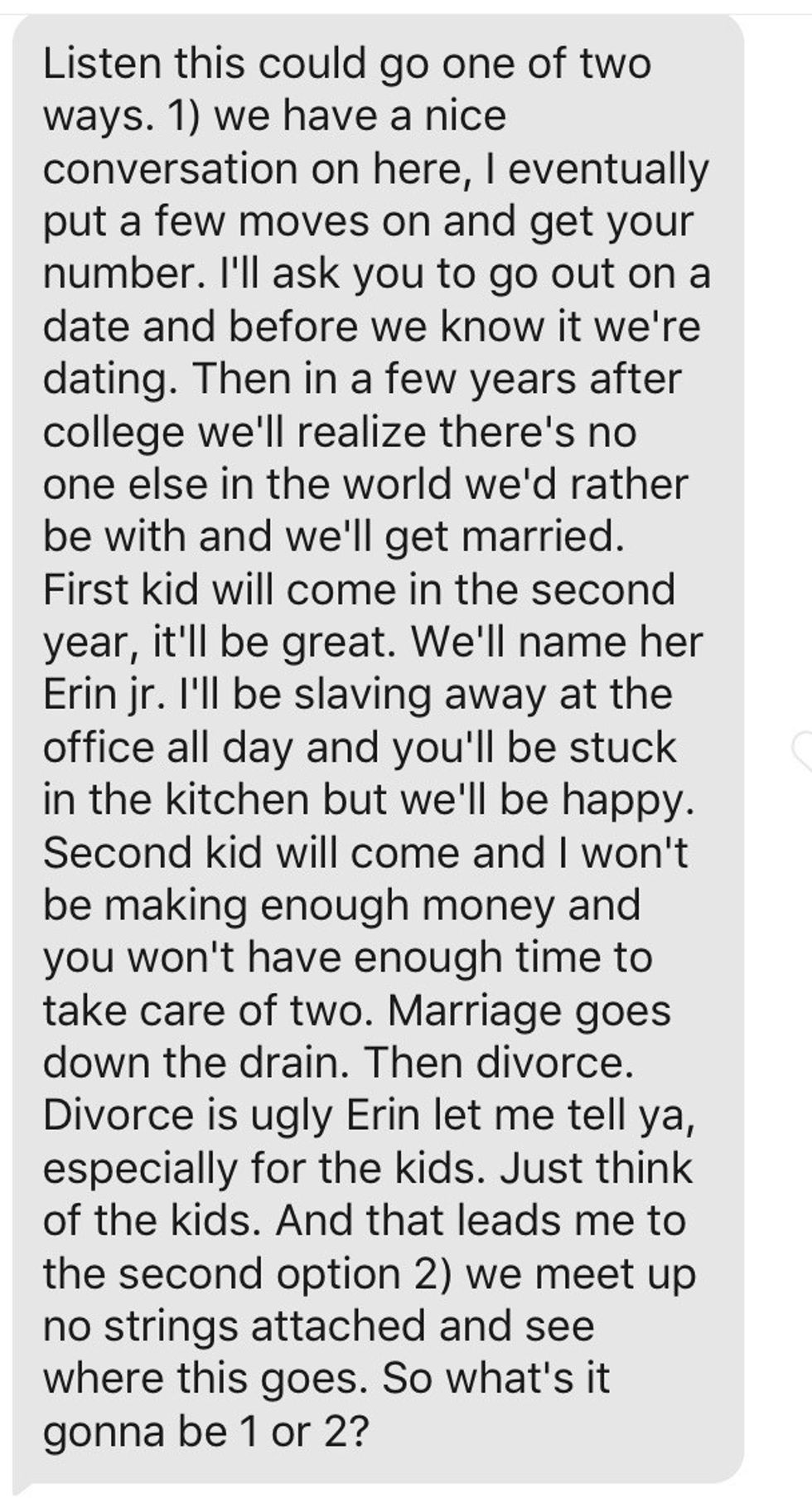 Loves to hear himself talk. Likes to cause arguments just to prove he is right. Majors in finance or something boring. Expects a housewife. Has severe childhood issues which he projects onto meaningless sex with meaningless girls on Tinder. Thinks this paragraph will actually work. Is afraid of commitment.