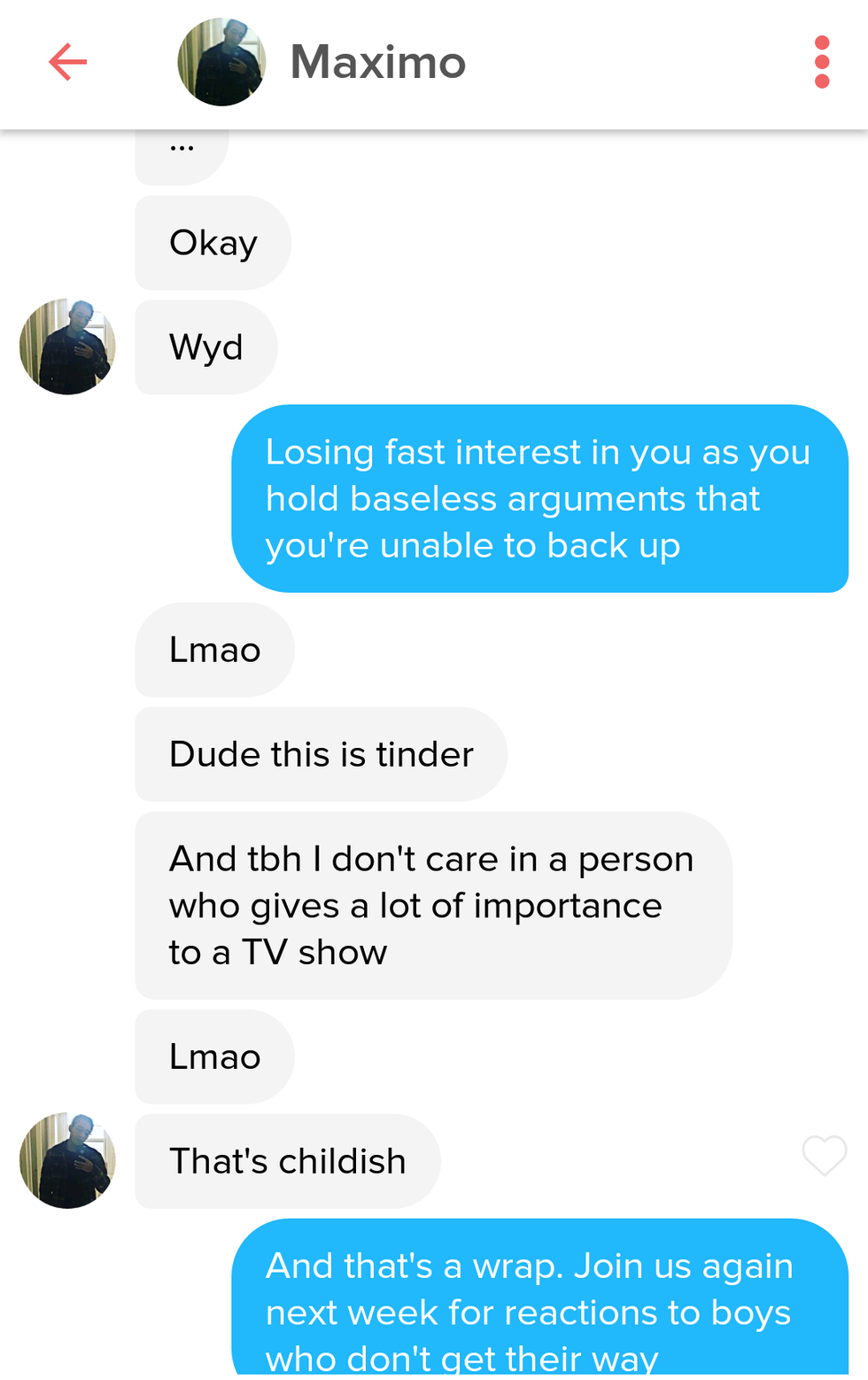 - The one who says that all the girls he matches with are crazy. He says this to a girl he matched with on Tinder.
