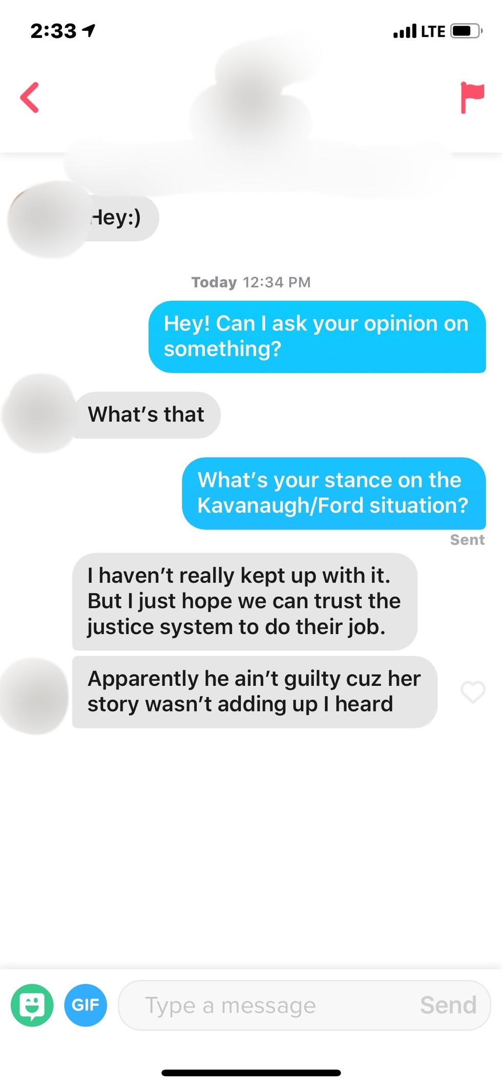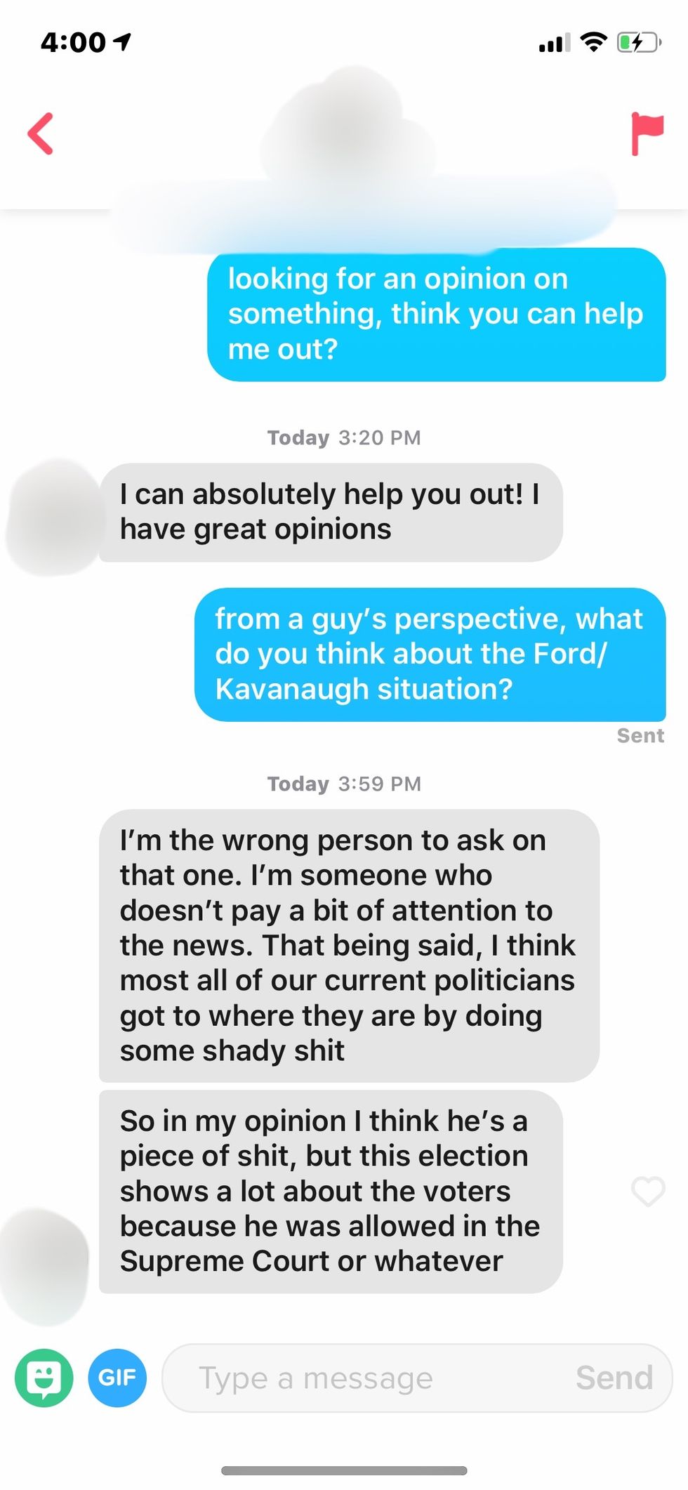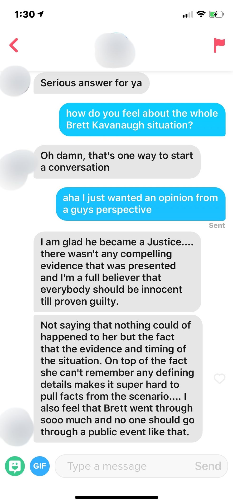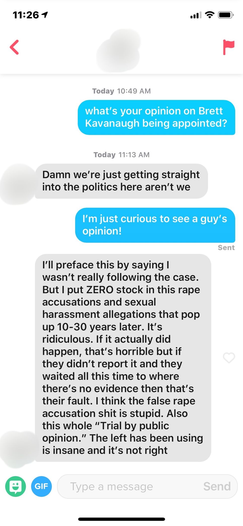 I had so many questions for this dude, but I unmatched with him as soon as I read his last sentence. Kavanaugh was the one who went through so much? Just Kavanaugh? Do you think Ford put herself through emotional distress for shits and giggles? May I also point out that Ford was questioned on national television as well?