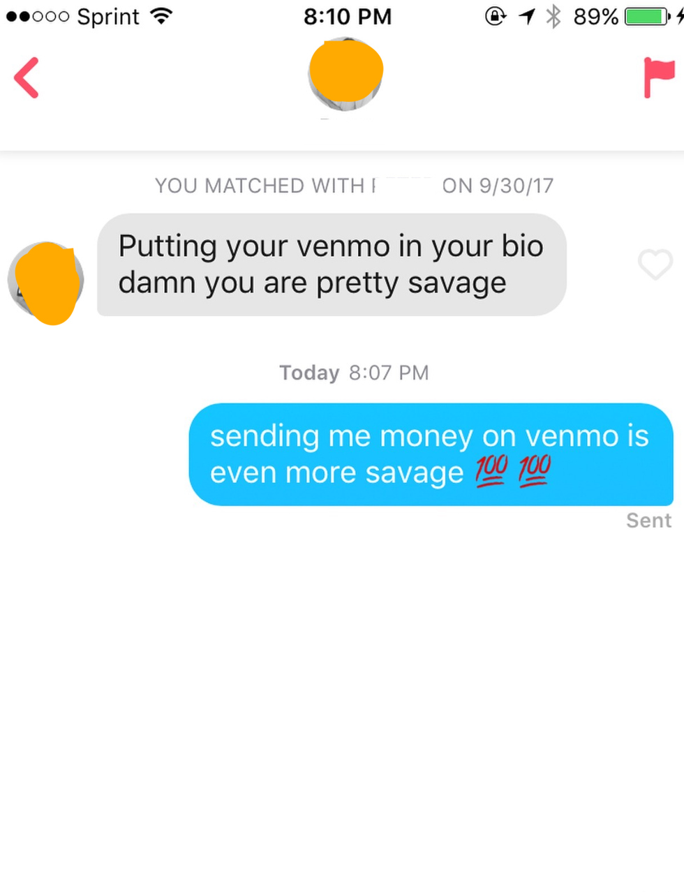 I am a broke college student, I had my Venmo username on my Tinder bio for a reason!