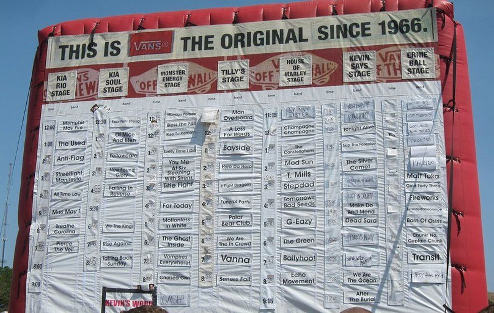 Tip 4: Make a meeting place with the person you went with, in case you get separated. There's honestly nothing scarier than being separated from your ride home, and your phone being on 1% battery. Yes, it's happened to me. I was terrified. Usually in the middle of the the venue, there's a giant inflatable wall that has the schedule for the bands on it, called the "Warped Wall". It can be seen from all over the venue, so it's a good meeting spot.
