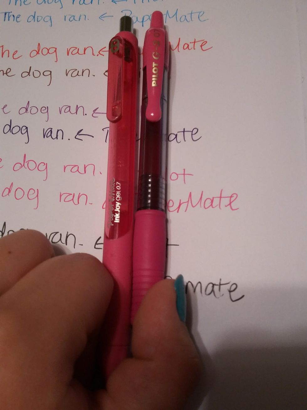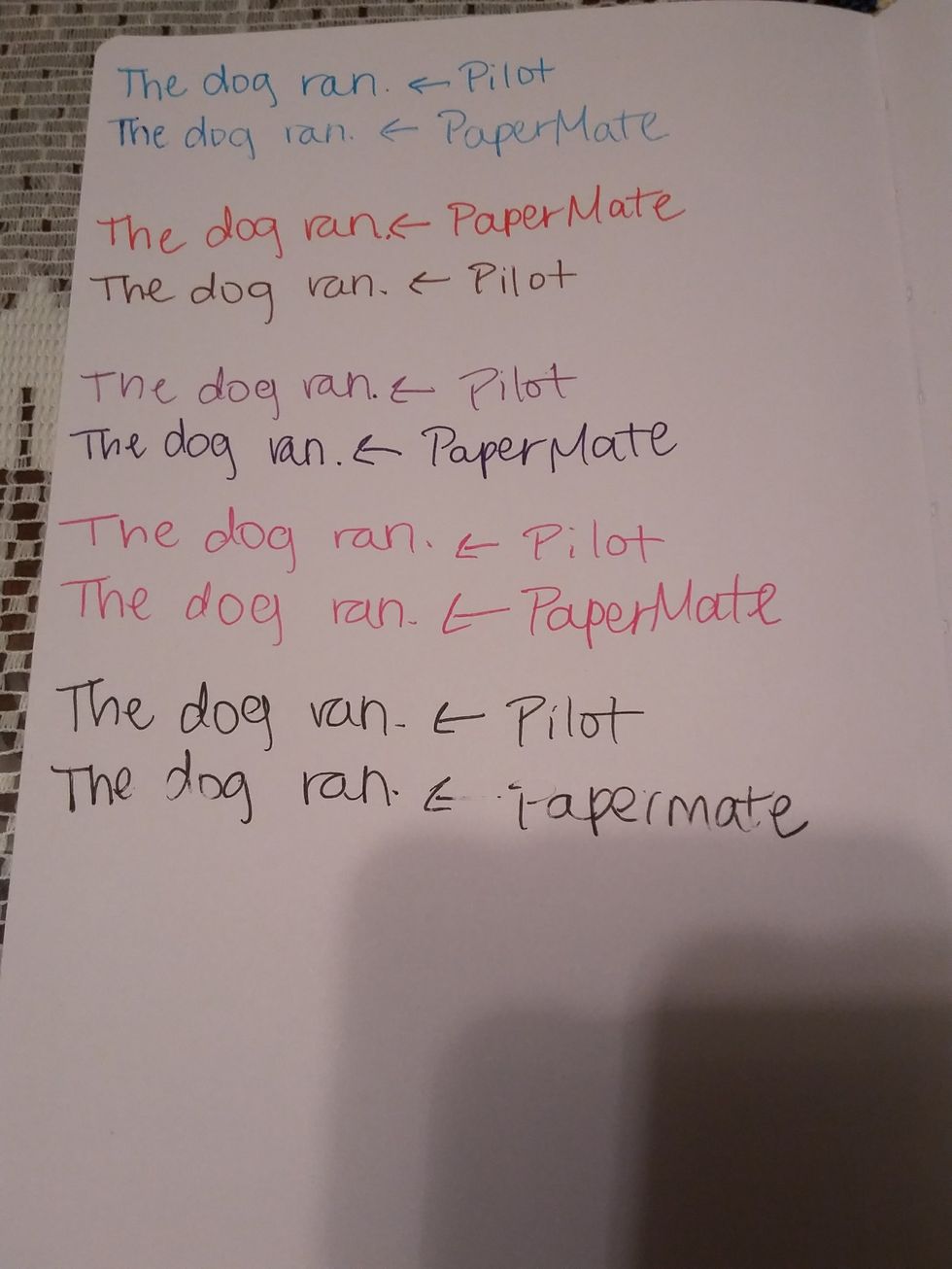 The PaperMate pens have a much smoother feel when it came to writing the following sentence: The dog ran. While writing with the Pilot pens, it felt harder to write, and it had a heavier feel. Because of the lighter ink of the Pilot pens, I would almost have to push down harder to get similar results within the PaperMates.