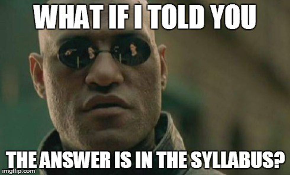 Remember when high school teachers used to give us our syllabi on the first day and you would never see it again? Well not in college. You need to save that thing--copy it, frame it, laminate it, hang it up, do whatever you want with it but that thing is your lifeline. It has all the dates, the ways professors figure out your grade (really important come finals), ways to contact your professor, and everything else you need to know. Plus teachers get really angry when 100 students are asking the same question, but it is clearly in the syllabus. Do not lose it!