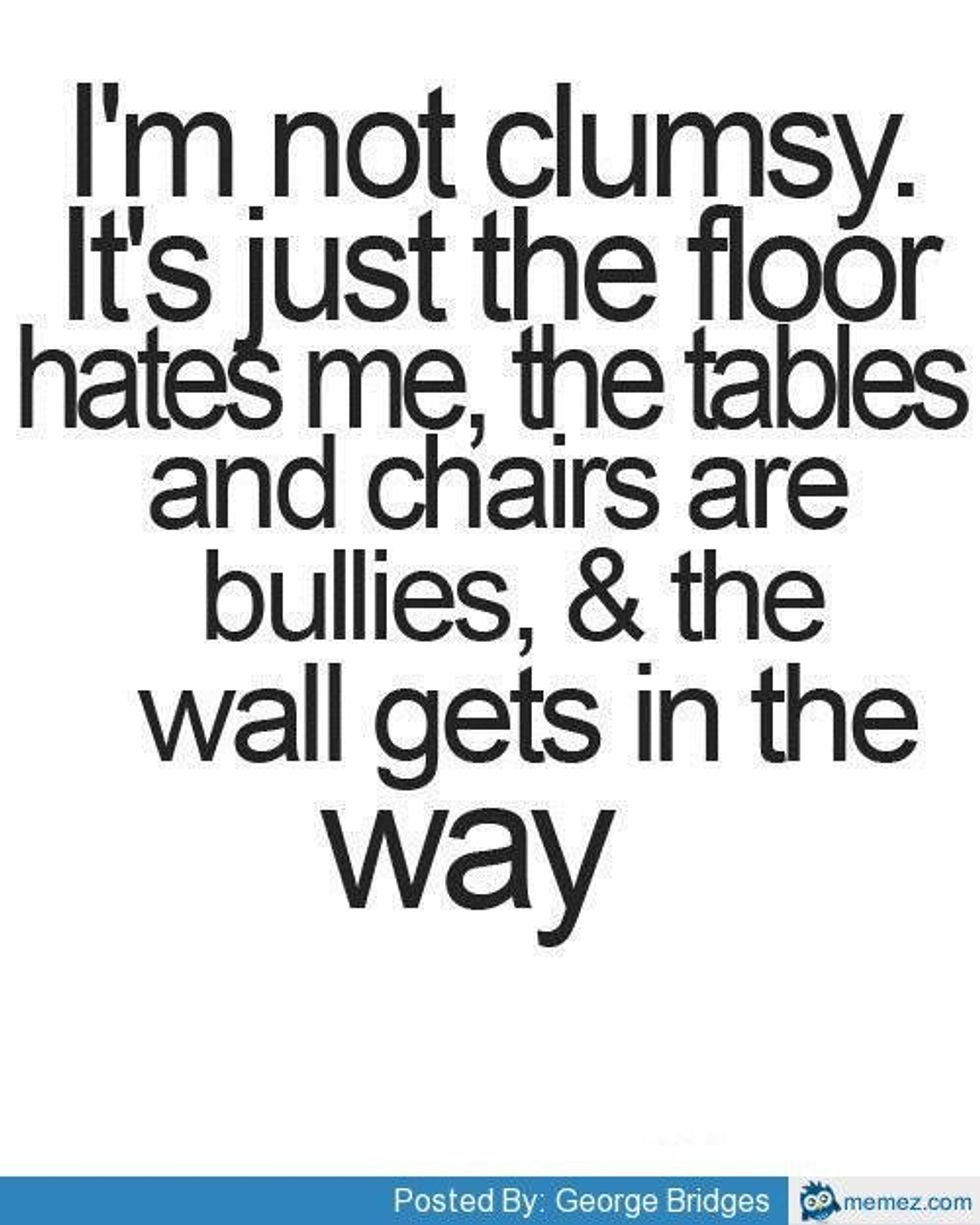 I am the definition of a clumsy and awkward human being. I'm the girl who can't walk in a straight line. I'm the girl who walks into a tree and apologizes (at least I'm polite about it). I'm the girl who trips over every crack in the sidewalk and bumps into other people and inanimate objects ever time I walk.