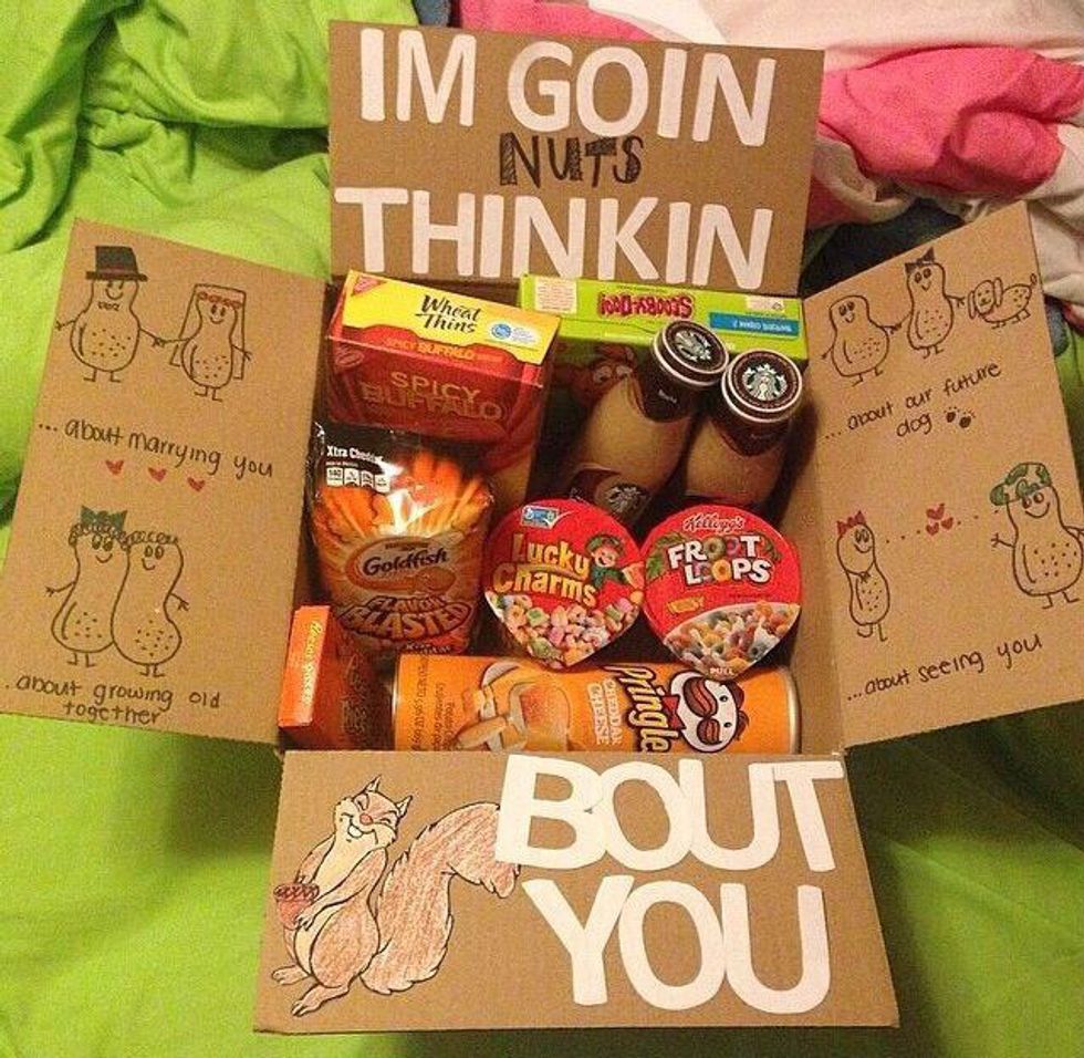 Some girls do color themes, choosing items that are all packaged in the same color. I try to make the items relate somehow. For example, I have done a workout box, filled with supplements, protein bars and sweats. Others might include: a breakfast box with instant coffee, cereal, granola bars, etc,