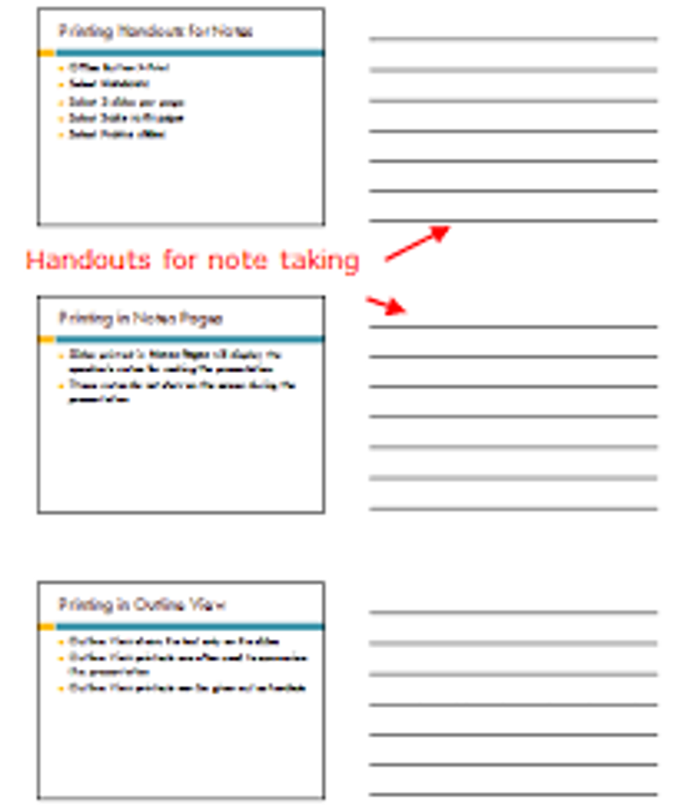 This allows me to take notes on the note lines, the slides, and the margins if I need to. I also do not print front and back, even though it saves paper. That way if I run out room on the side with the slides, I can still continue on the back of the page and keep all the same information together.