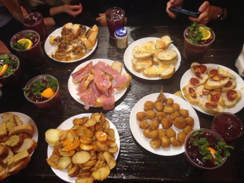 "¿Quieres tapear?" So Spain's eating schedule is vastly different from the USA. Breakfast is light with a large lunch around 2-3 p.m. with snacks in between. Dinner doesn't roll around until at least 9 p.m. and many people eat later. Due to the late hour, people prefer to go out and share what are essentially appetizers. If you're lucky, you'll find a bar that gives you free tapas with the purchase of a drink. (If anyone reading this plans on going to Madrid- El Tigre has multiple locations and serves you a mountain of free tapas as pictured above).