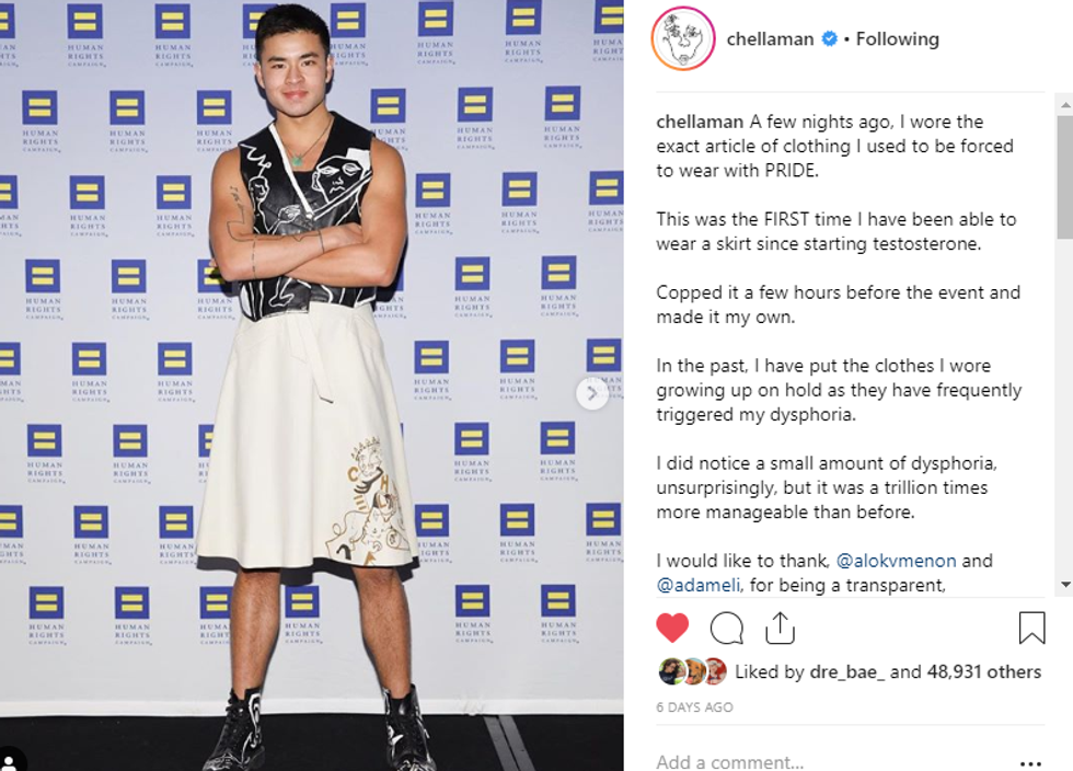 At the risk of being redundant, Chella Man is an excellent example of this. He's trans masculine, gender queer and uses he/him pronouns, but still isn't afraid to rock a skirt and heels if he feels like it. We would all be lucky to be even half as brave and authentic as Chella.