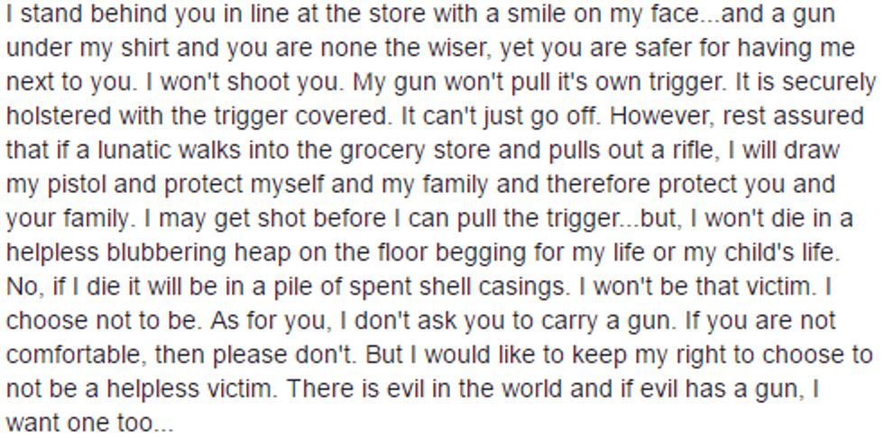 One of the most annoying copy-and-paste chains is "I stand behind you in line at the store with a smile on my face." This chain is about gun control and concealed carry, and I have recently seen it about a hundred times on my Facebook feed because of the Orlando shooting. Does anyone else find that part of the sentence completely creepy? This part doesn't have anything about a gun in it. Congrats on defending yourself and others if there happens to be a situation, but it's not a secret if you post on Facebook about how you carry a gun with you.