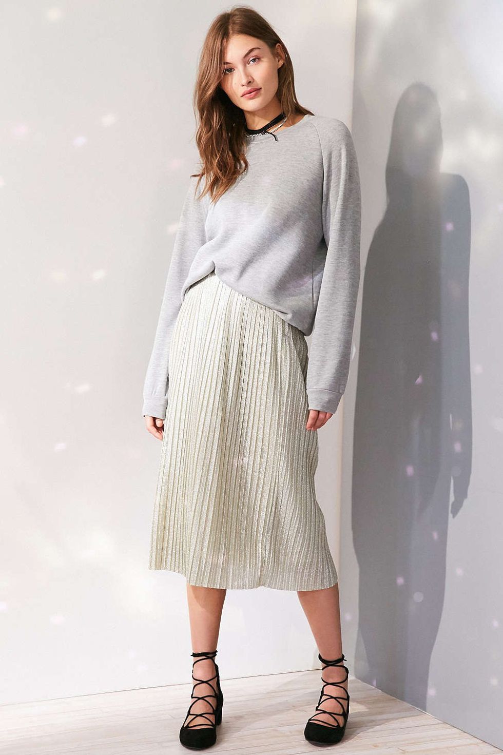 The shimmery pleated fabric of this skirt is so exciting - I love the texture it adds, almost a pattern in an otherwise patternless outfit. Of course, combined with a sweater or sweatshirt it's also ridiculously comfortable. The midi length means it's short enough to stay out of the way, but long enough to avoid being constantly wary of bending over or twirling too much. In a shimmery skirt like this during the holidays, of course, twirling is an unescapable eventuality, so I consider its safe twirlability a good thing.