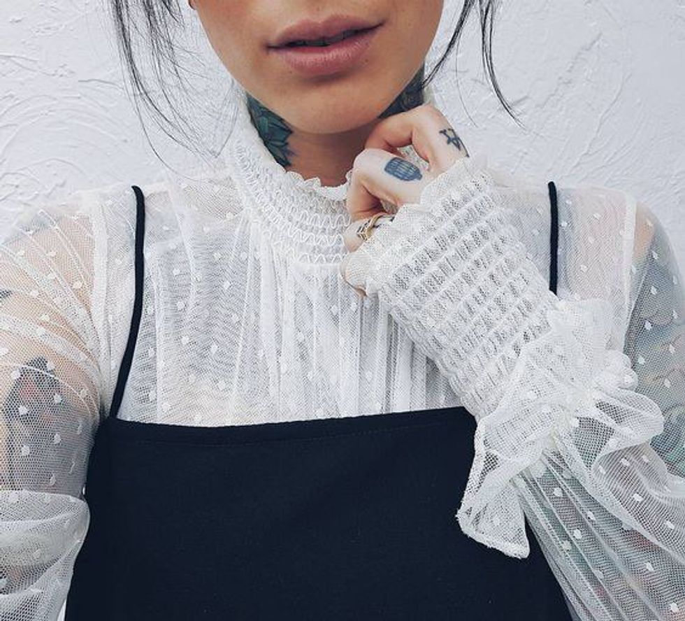 There's something about layers of sheer fabric that takes on a shimmery quality of its own. I love the victorian femininity of this shirt, so creative layered under a spaghetti-strap dress as an alternative to the more common t-shirt under such a dress. It has just that little bit extra sophistication that we like for the holidays, and the polkadots in this example echo the fluffy snowflakes falling outside.
