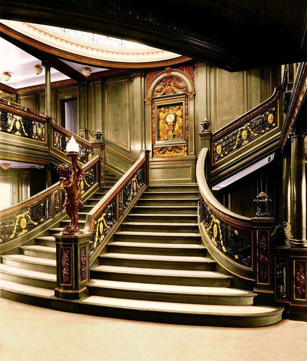 Determined not to be outdone, White Star Executive J. Bruce Ismay and Harland & Wolff shipyard director William J. Pirrie sketched on a napkin the idea for a class of liners that were so luxurious, they would forever be ingrained in history as the epitome of luxury and elegance. (Please note that the pictures below are not from the Titanic herself, but from her nearly identical twin, the RMS Olympic, the interior of which was partially auctioned off before being scrapped in 1935. There are very few original photographs of the Titanic, and none whatsoever of her grand staircase. The color photo shows what the ship’s remodeling in 1932-1933 could have looked like, when the staircase’s oak paneling was painted green.)